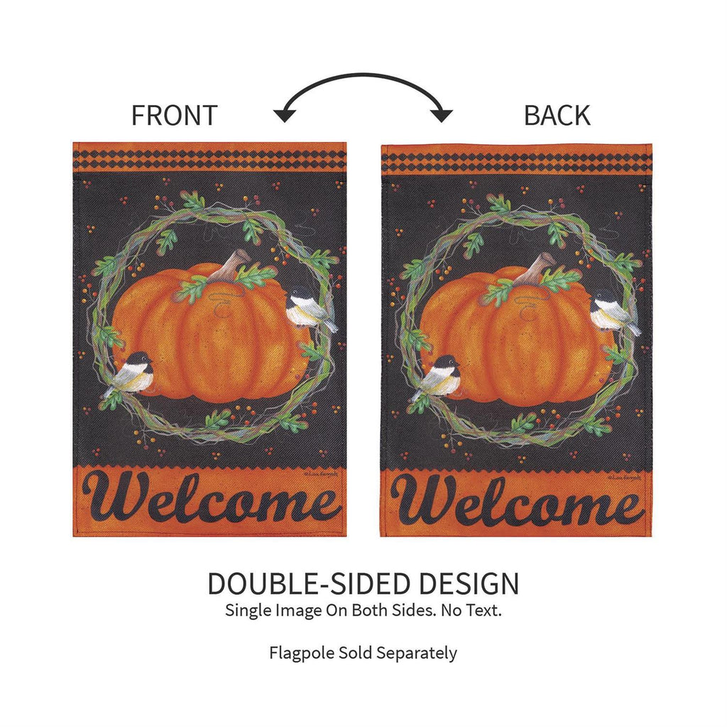 Add a touch of autumn charm to your outdoor space with the Chickadee and Pumpkin Burlap House Flag. Measuring 28.0 inches in width and 44.0 inches in height, this vibrant flag features a delightful design of chickadees perched around a large pumpkin, surrounded by greenery. The warm orange and black color palette is perfect for fall, creating an inviting atmosphere at your home’s entrance. Made from durable burlap, this flag is designed to withstand outdoor elements while maintaining its rich colors.