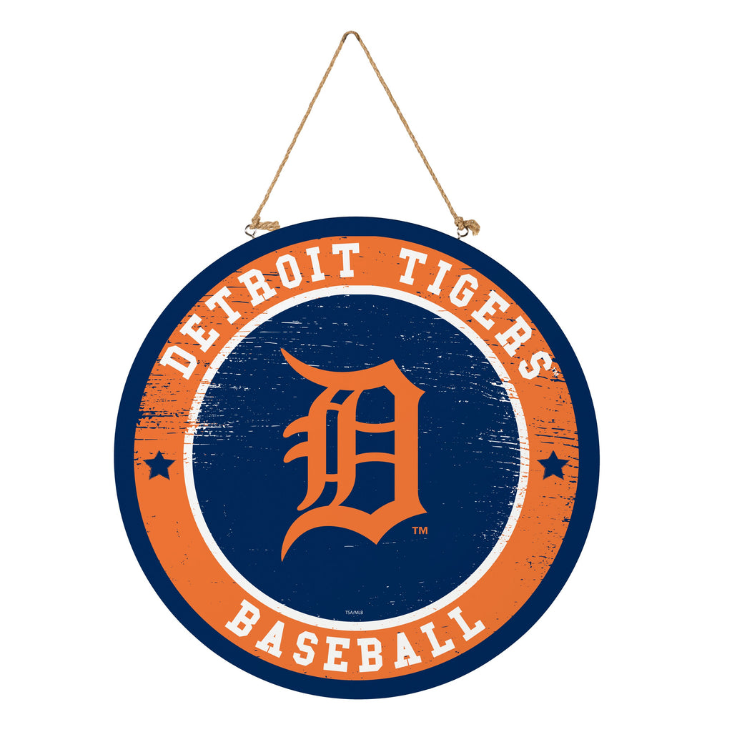 Show off your team spirit with this Detroit Tigers round door decor, featuring a rustic design and hanging rope for easy installation.
