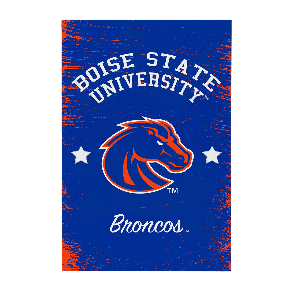 Show your school spirit with this Boise State University wood wall sign, featuring a bold design in blue and orange. Perfect for any fan's home or office decor.