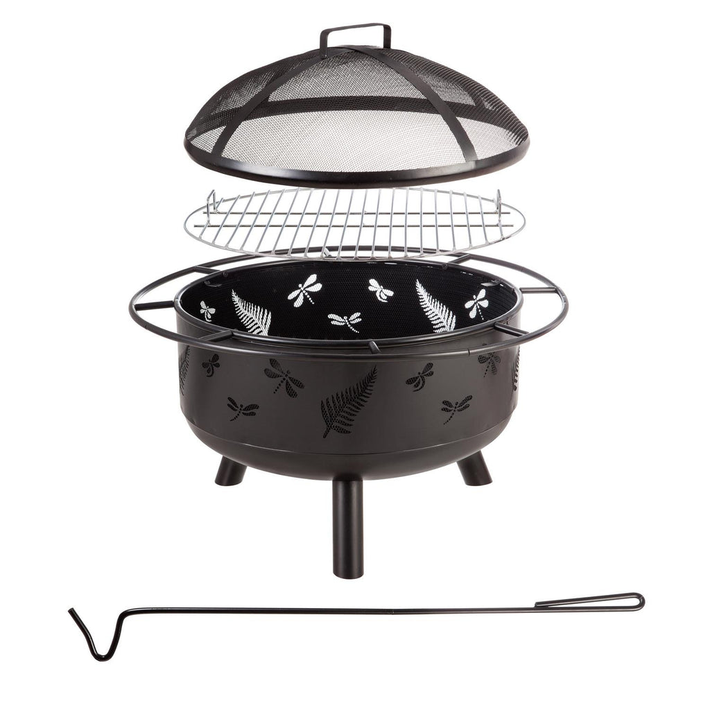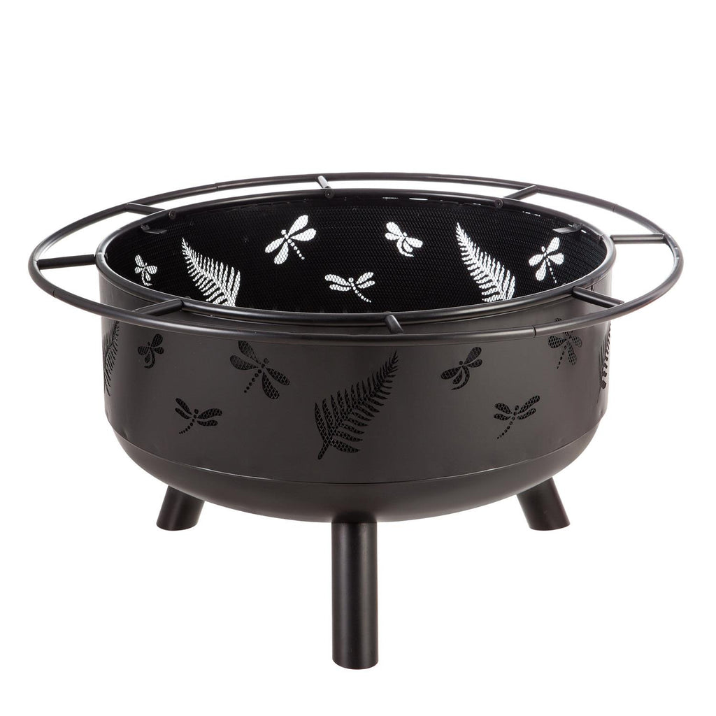 Transform your outdoor space with the Dragonfly Wood-Burning Fire Pit, featuring a charming dragonfly and leaf cutout design. Measuring 30 inches in diameter and standing 23.5 inches tall, this fire pit offers ample space for a cozy fire to gather around with friends and family. Crafted from durable steel, it ensures long-lasting use and adds a rustic touch to your patio or garden. The mesh lid provides safety by containing sparks, while the built-in ring handle makes it easy to reposition. Perfect for cool evenings or summer gatherings, this fire pit combines functionality with aesthetic appeal.