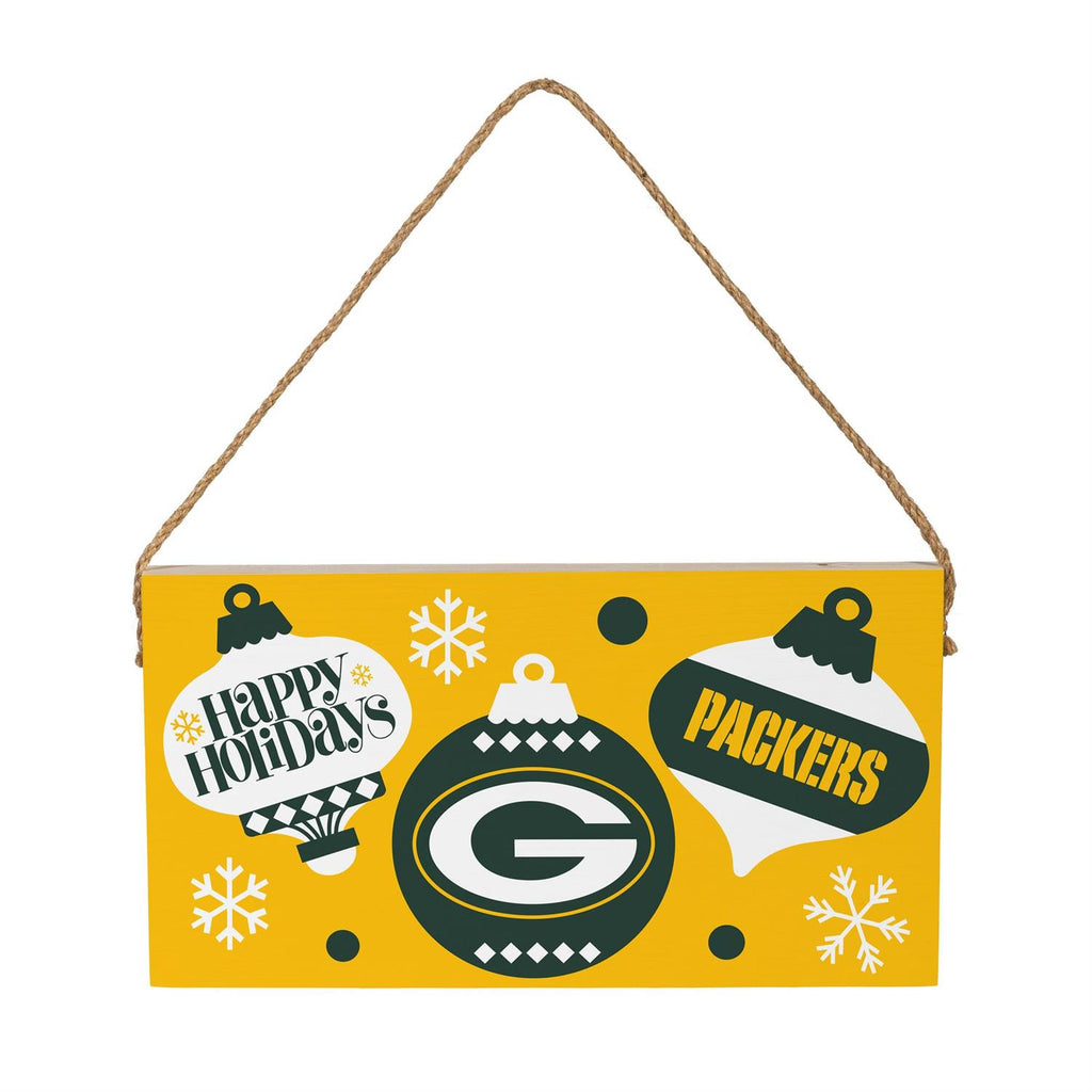 Celebrate the holidays with team spirit using this Green Bay Packers Holiday Wood Wall Sign. Measuring 6x11 inches, this charming sign is the perfect addition to your festive décor. Crafted from durable wood, it features the iconic Packers logo and holiday ornaments, making it a standout piece for any fan's home. The vibrant yellow background is accented with snowflakes and a sturdy rope hanger for easy display. Ideal for adding a touch of team pride to your living room, office, or fan cave this season.