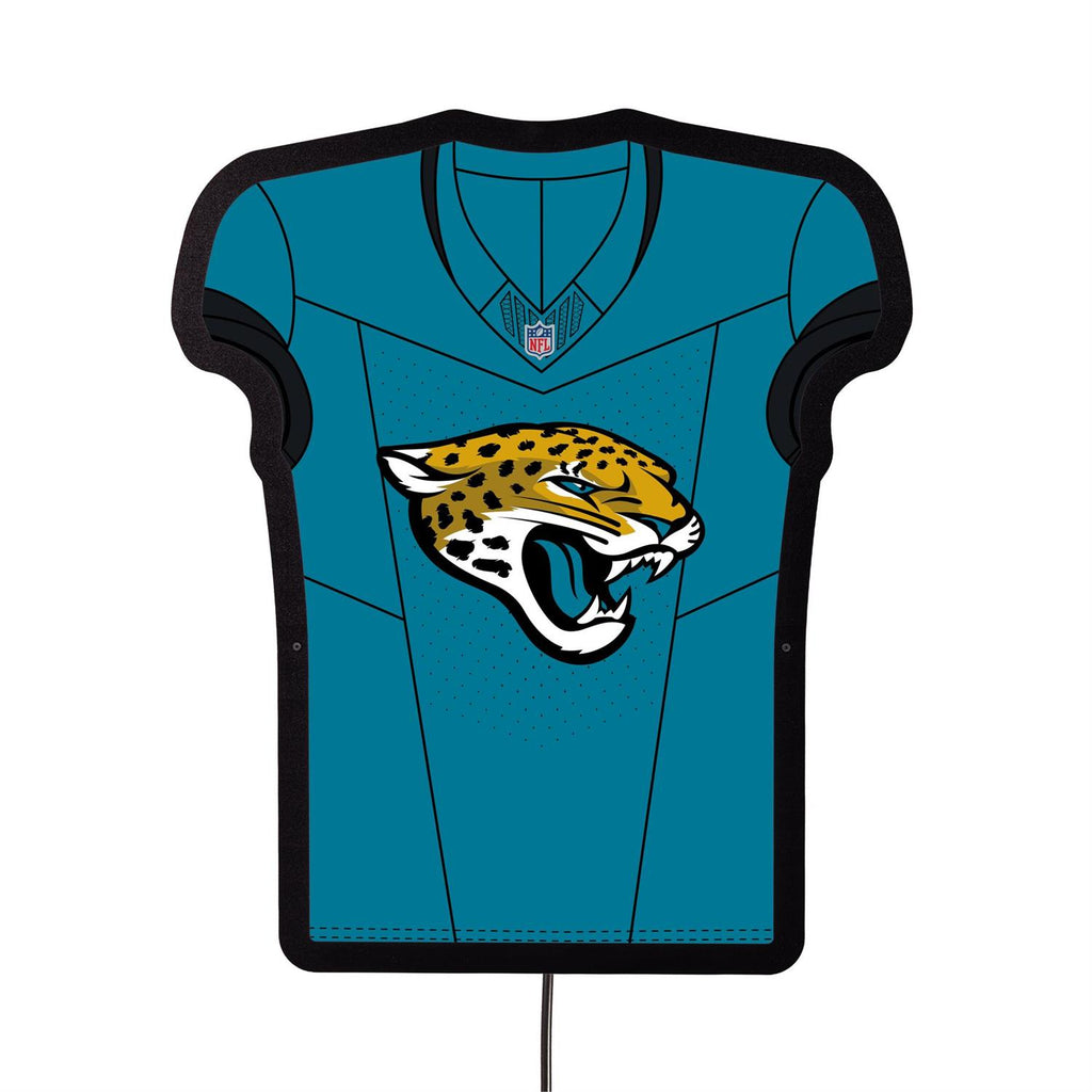 Illuminate your space with the Jacksonville Jaguars NFL Football Jersey Edgelite LED Decor. Perfect for die-hard fans, this striking wall décor piece showcases the iconic team jersey in vibrant detail. Measuring 23 inches square and just 0.38 inches thick, it's a sleek addition to any room. The LED lighting brings an eye-catching glow to the jaguar logo, making it ideal for game days or everyday decoration. Easy to hang and perfect for creating a spirited atmosphere, this piece is a must-have for any Jaguars supporter.