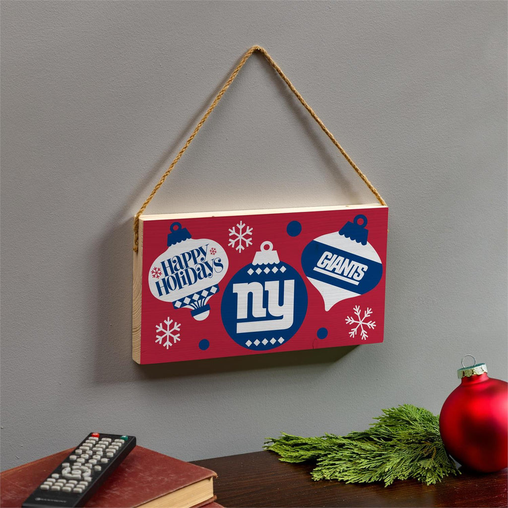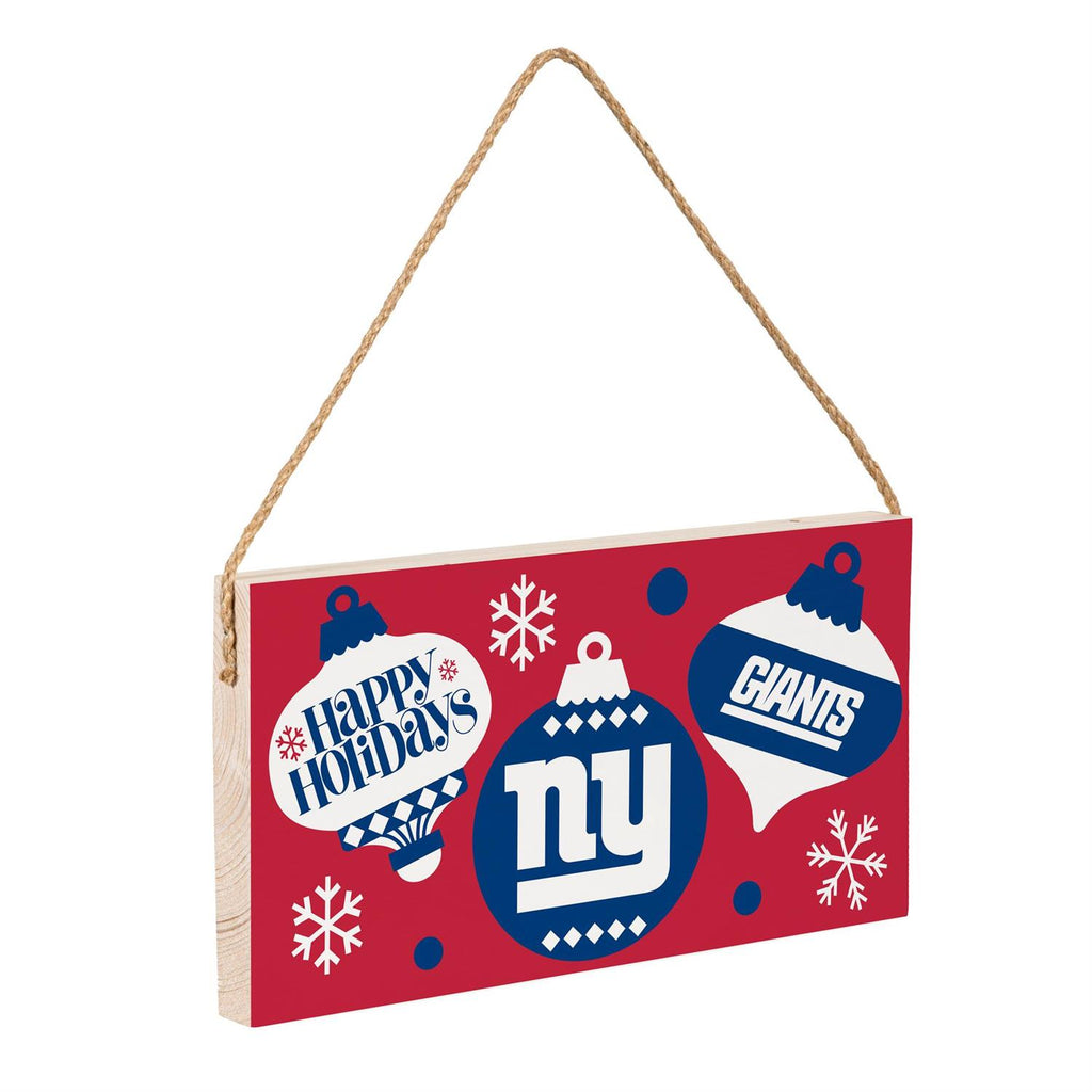 Celebrate the holiday season with this New York Giants Wood Wall Sign. Perfect for any fan, this 6x11 inch sign features festive colors and designs, including iconic Giants logos and holiday motifs like snowflakes and ornaments. Made from durable wood, it’s an ideal decoration for your home, office, or fan cave. The sign includes a natural rope for easy hanging, adding a rustic touch to your décor. Show off your team spirit while spreading holiday cheer with this charming wall sign.
