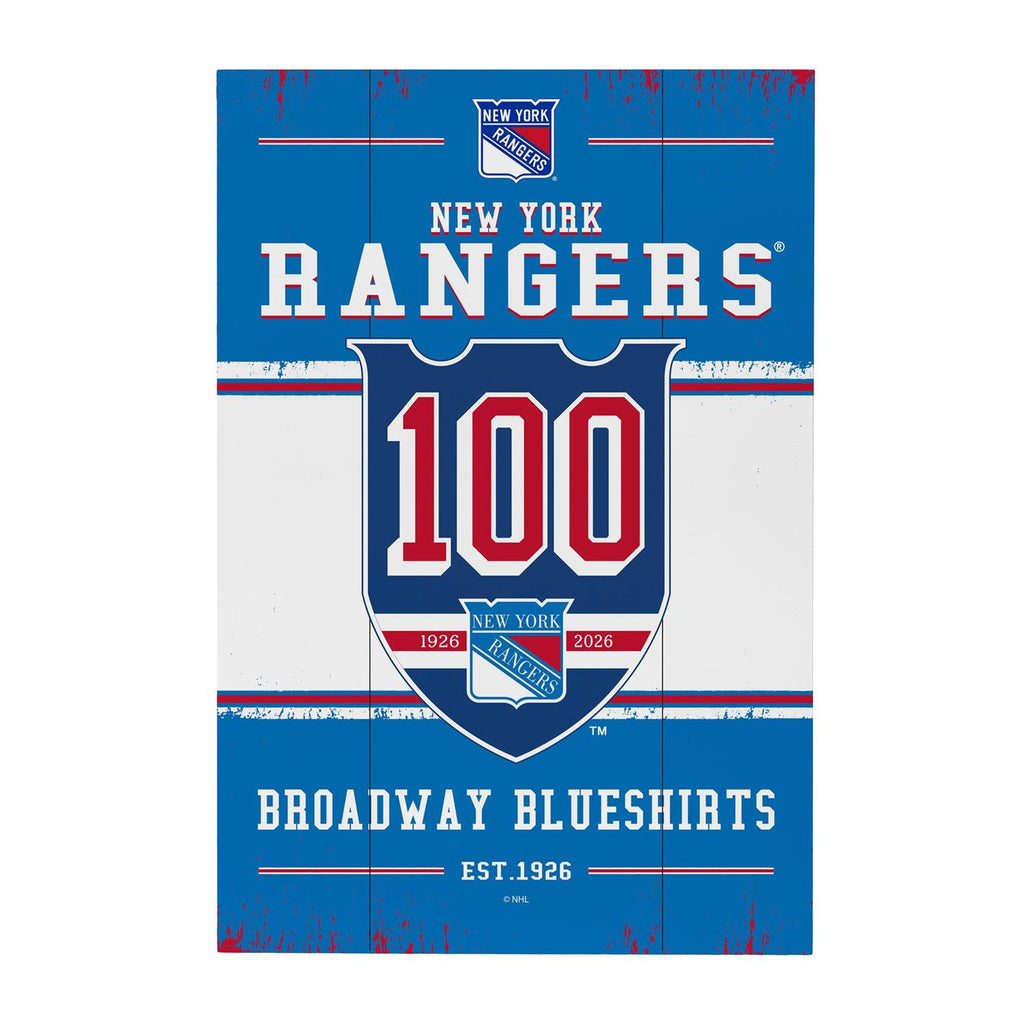 Celebrate a century of New York Rangers history with this 100th Anniversary Wood Wall Sign. Measuring 16x24 inches, this vibrant sign is the perfect addition to any fan's collection, showcasing the iconic team's colors and logo. Crafted from quality wood, it offers a vintage feel while honoring the legacy of the Rangers. Ideal for hanging in your game room, office, or man cave, this sign is a must-have for any dedicated fan. Perfect for commemorating a milestone or gifting to a fellow enthusiast.