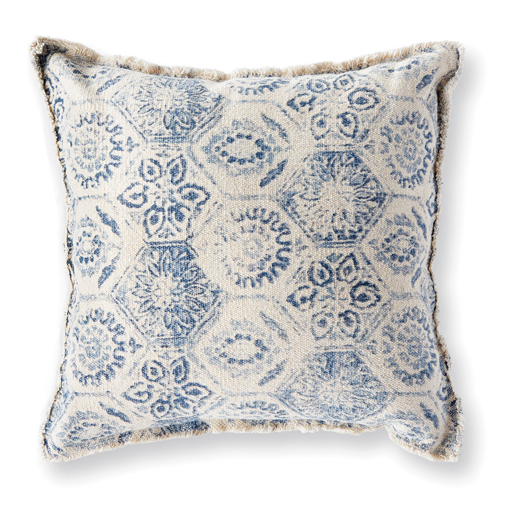Tone on tone pattern in soothing blue make this a must-have accessory for the sofa. Soft cotton & gentle fringe make for a comfortable landing after a long day.