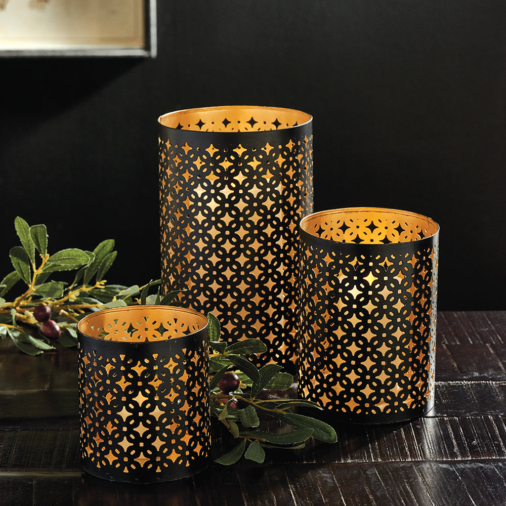 With a decorative die cut pattern and modern shape, this set of hurricanes adds character and charm. The metallic gold interior adds a vibrant glow.