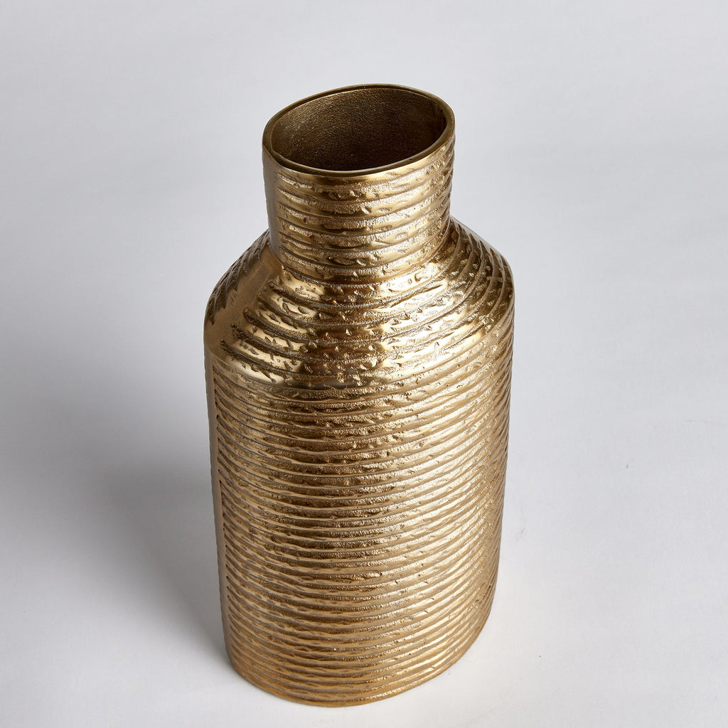 The vases are crafted from cast aluminum, featuring a texture-like banding that adds a golden touch to any shelf or countertop. Available in two sizes, 6.5 x 4.5 x 12.5 inches and 8 x 5.75 x 15.5 inches, these vases can be enhanced with faux stems or displayed as is for a clean, minimalist look.