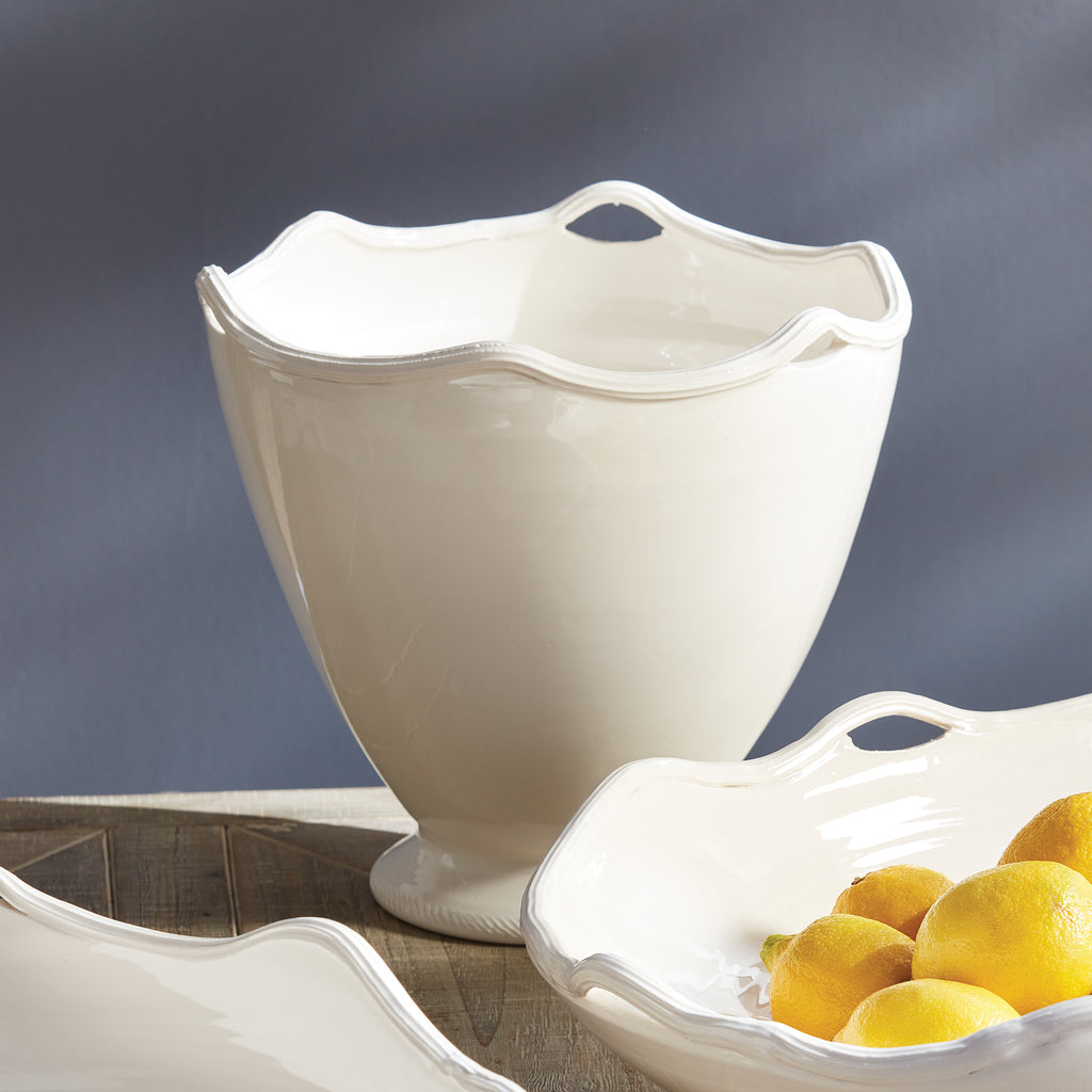 The Serafina Footed Urn is handmade by Italian artisans in Tuscany, Italy. With a classic Italian craftsmanship passed down through generations, each piece is a true original. The undulating piped edge rim is pure artistry, and that glaze! A show-stopping piece for feature table, kitchen island or mantel.