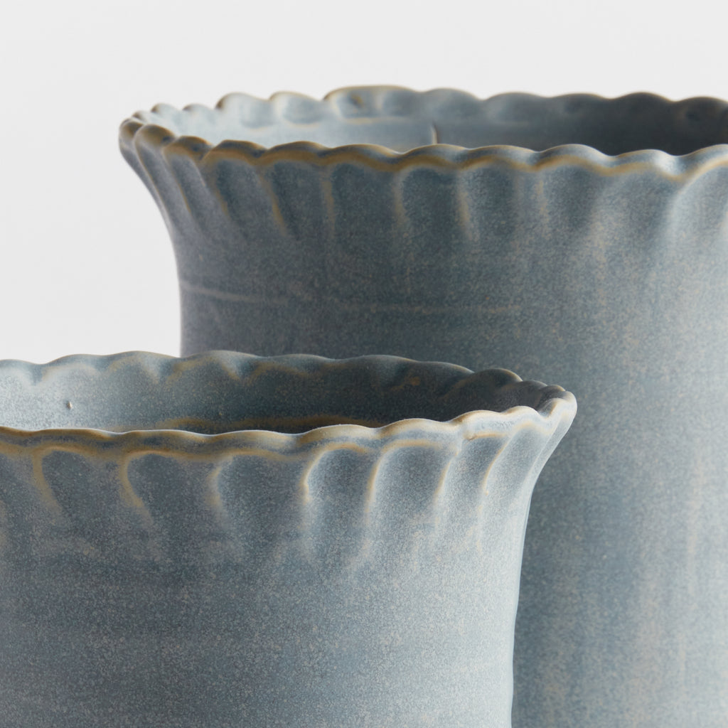 What makes these pots unique is the deep, aqueous glaze. Made of a high-fired stoneware, the rich depth of color is on full display. The pie crust detail along the rim adds a notable charm.