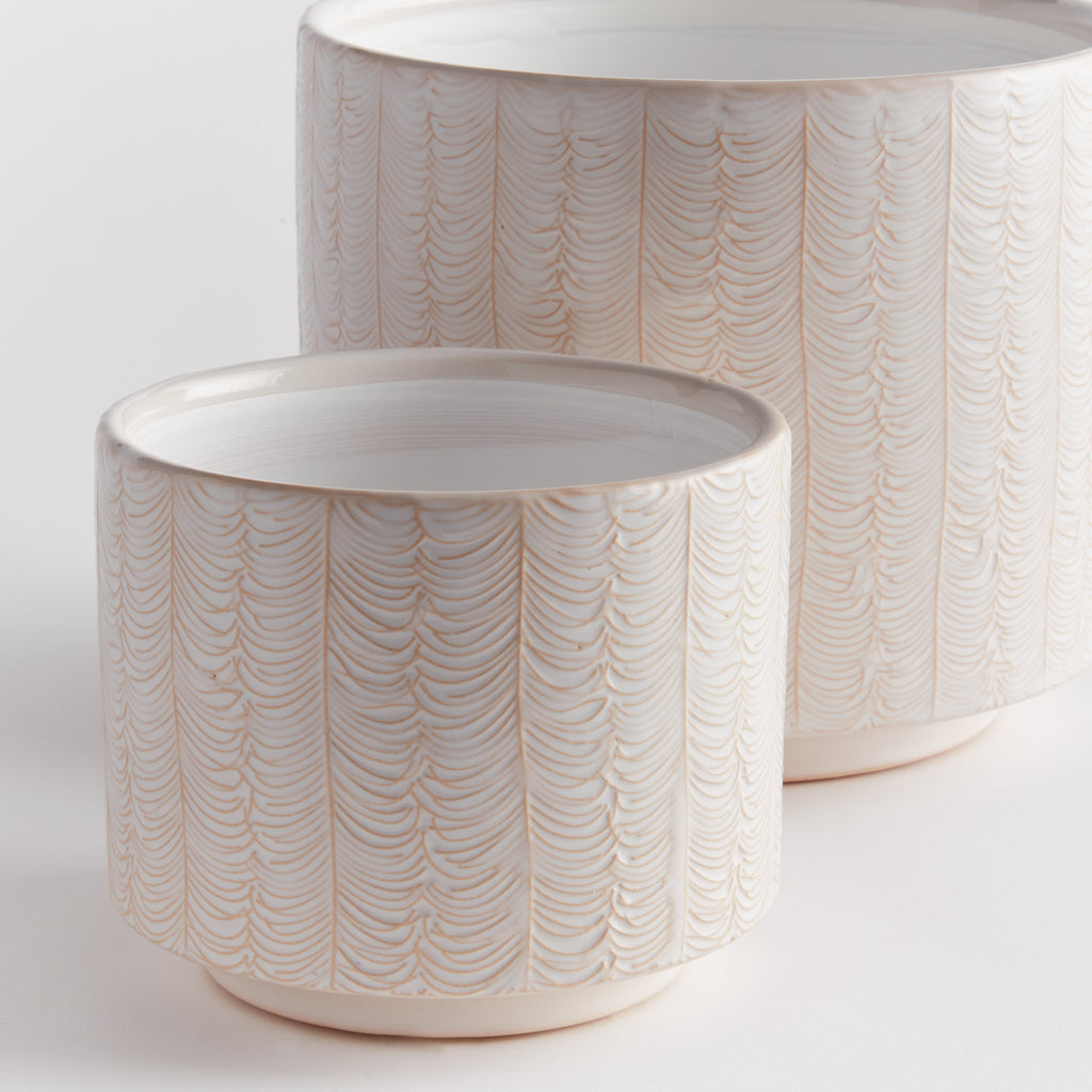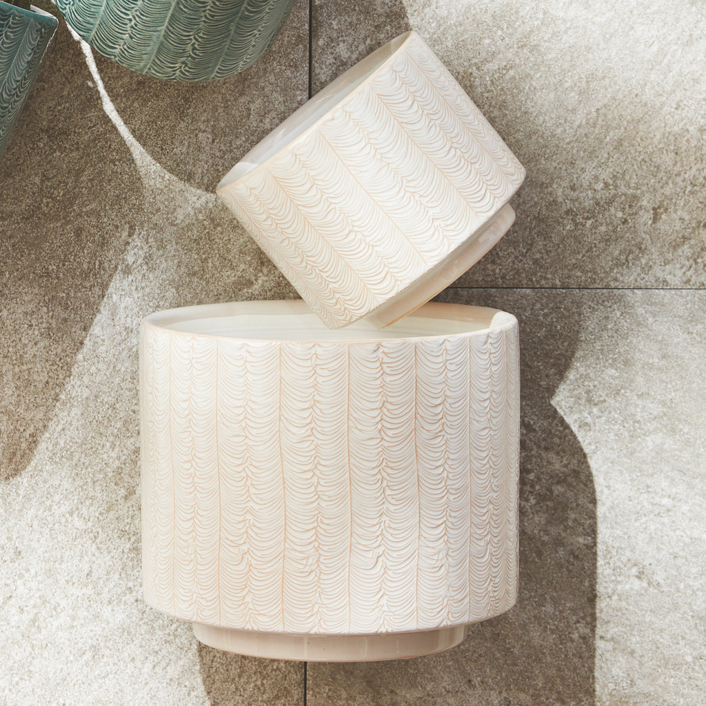 The wispy, feather-like pattern in a serene soft white reactive glaze effortlessly draws the eye and adds a touch of contemporary flair to any setting. These pots are not just containers, they're works of art!
