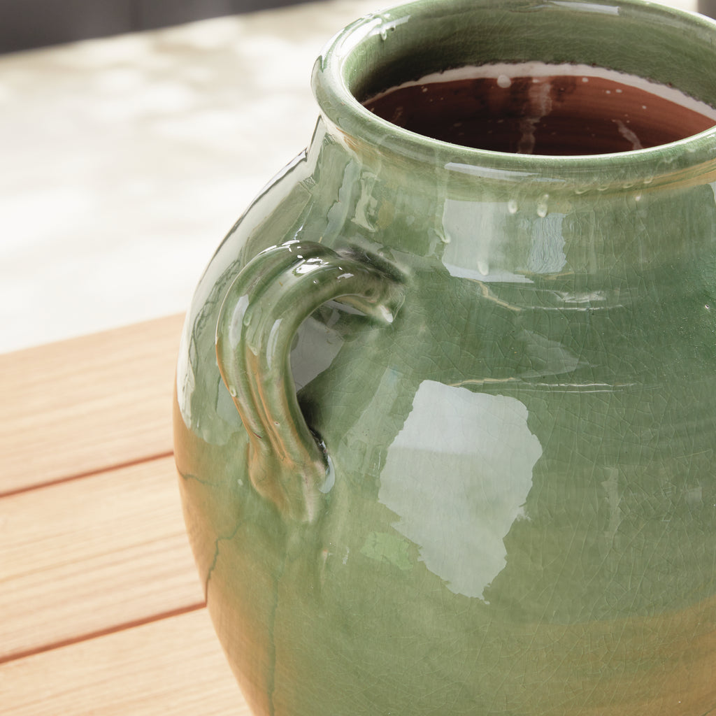 Inspired by traditional ceramics of southern Europe, this decorative vase really brings the charm. Hand-thrown with a subtle crackled glaze and raw terracotta base, it adds a rich verdant pop of color to kitchen table, counter or mantel.