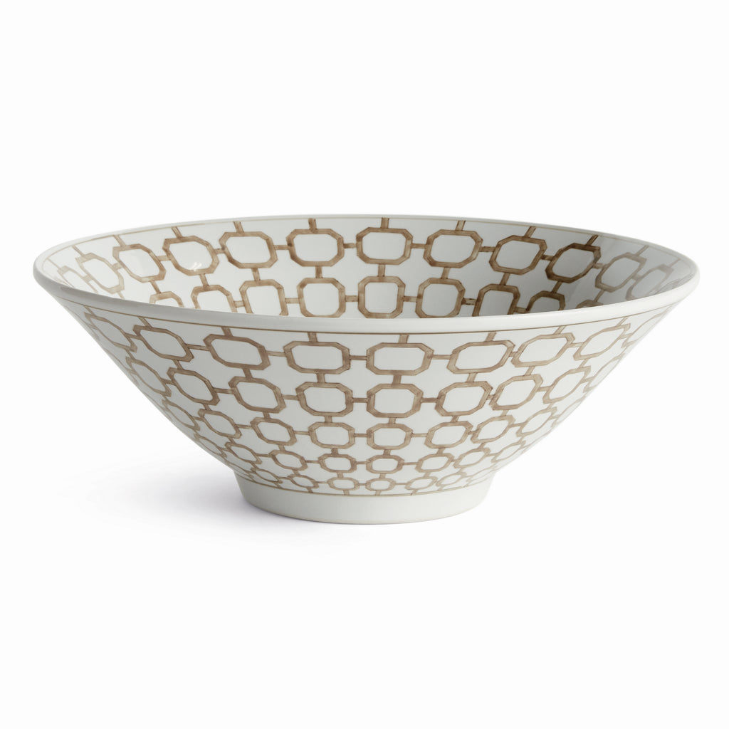 A classic chinoiserie pattern in taupe and white. In design, taupe is often associated with muted, sophisticated qualities. It evokes balance and timelessness. A tone that plays well in any palette, and is an inspired design choice for this elegant decorative footed bowl. A welcome addition to kitchen island, coffee table or mantel.