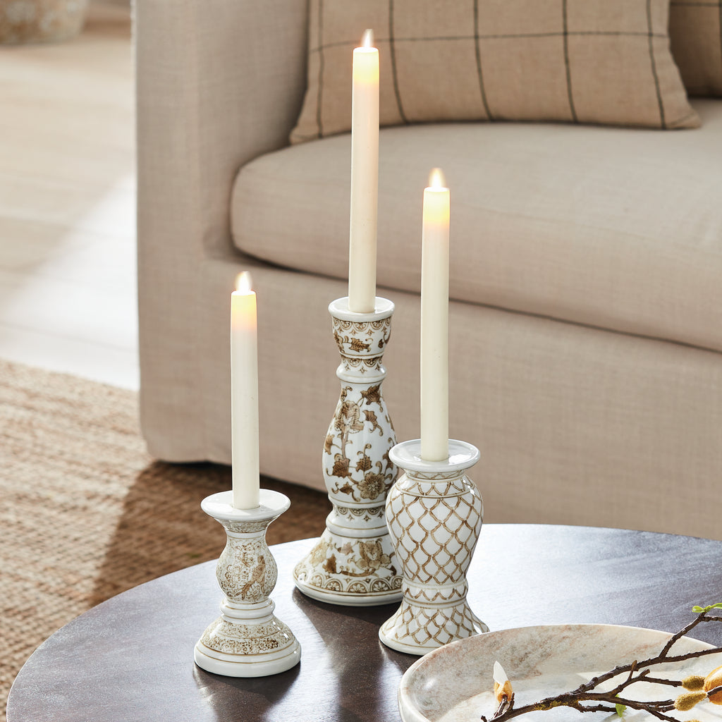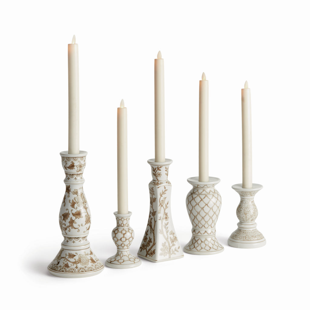 A classic chinoiserie look in taupe and white. In design, taupe is often associated with muted, sophisticated qualities. It evokes balance and timelessness. A tone that plays well in any palette, and is an inspired design choice for these coordinating taper holders. They are a welcome addition to the well-appointed bookshelf, mantel or entry console.