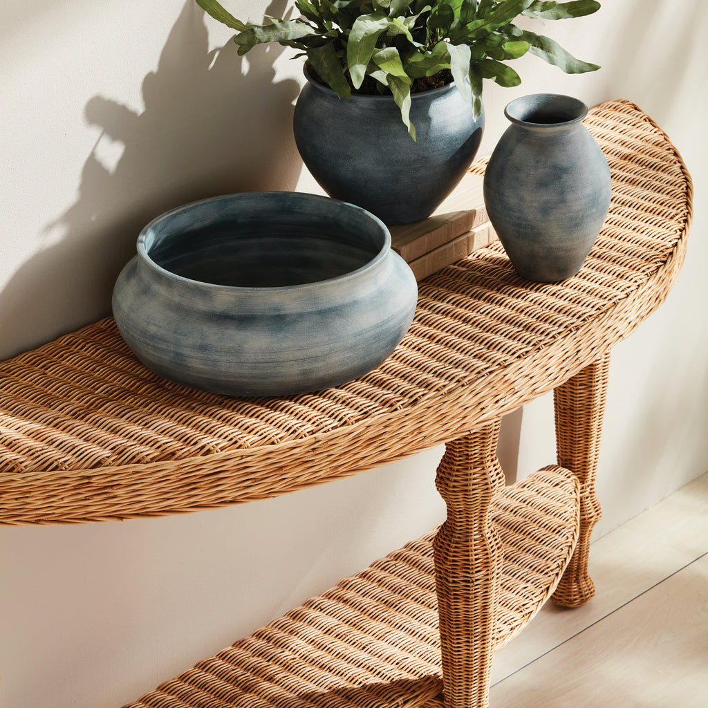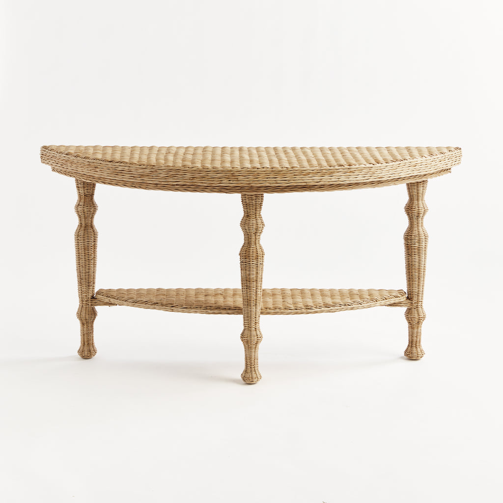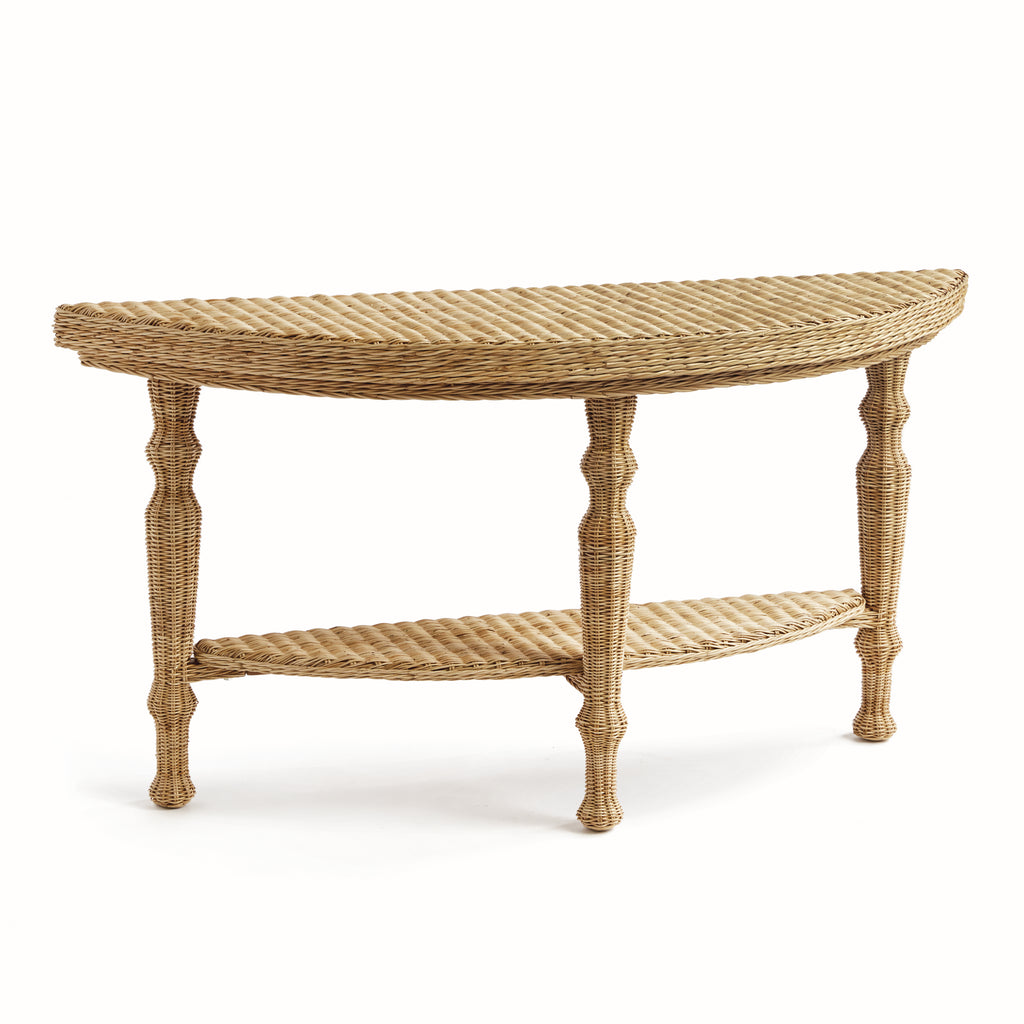Our tailored demilune table is made from slimit rattan, one of the most resilient weaving materials available. A woven masterpiece in a thick, cane rattan weave from base to top, this table makes an exquisite entry table.
