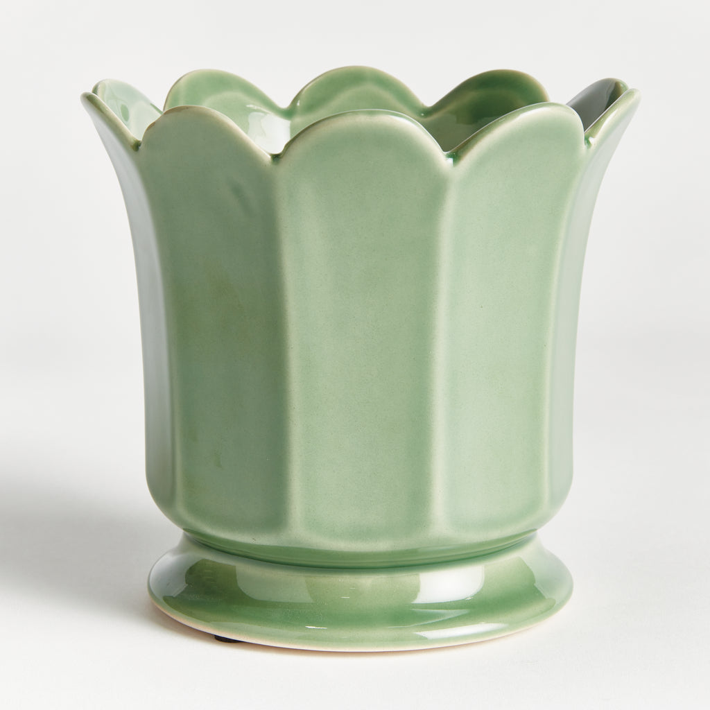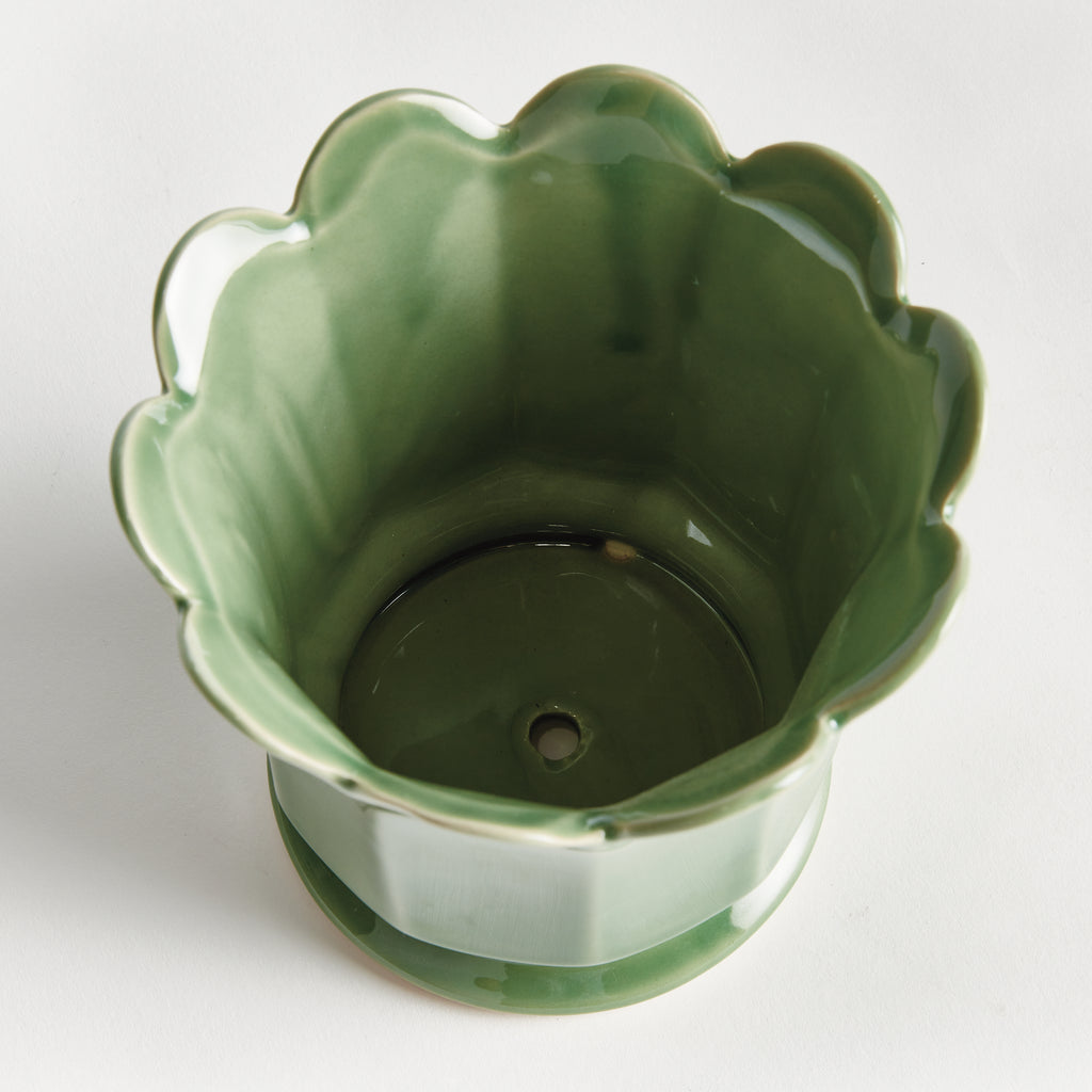 In a classic silhouette with petal edges, this footed pot is nature-inspired. Finished in a soft verdant reactive glaze, it is a great way to add a touch of color to any space.