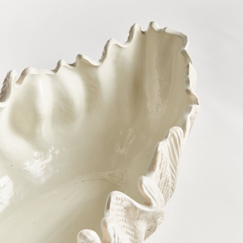 The beauty is in the details. The scale and craftsmanship of this decorative bowl are what makes it truly extraordinary. The motion-like design of the fronds and rich, reactive glaze create a stunning centerpiece atop a kitchen table or island. Add some natural orbs, or a faux floral drop-in for some extra drama and height.