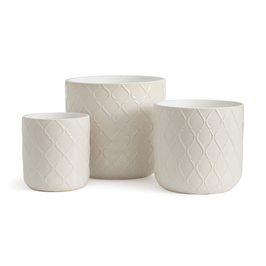 The beauty in these pots is the pattern created naturally by the glaze and texture of the clay. Available in four cool, soft tones. Something for everyone.Has drain holes.Drop-in sizes: G, F and D