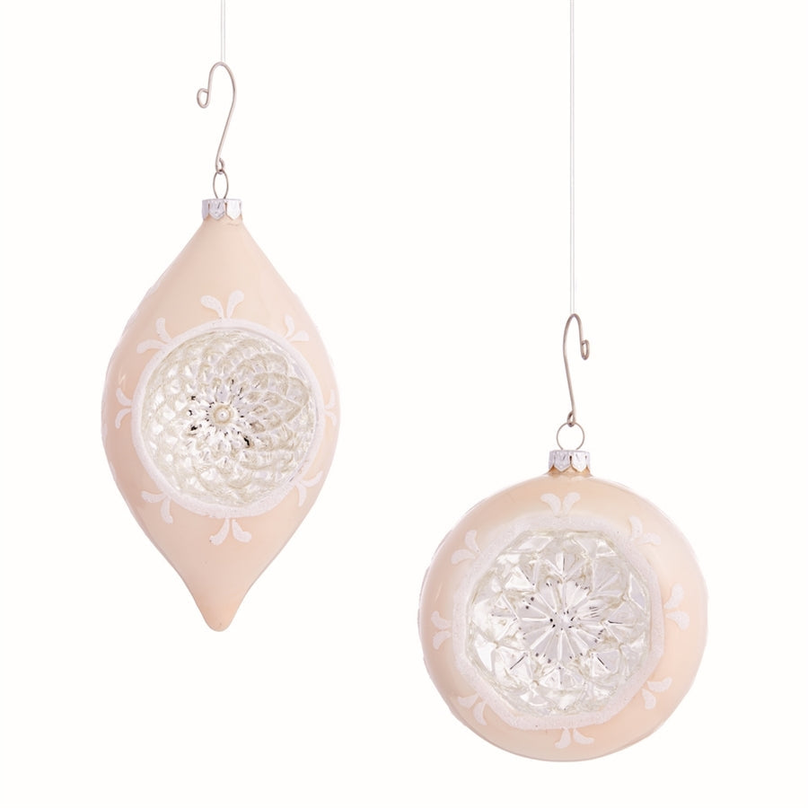 Creamy glass ornaments in blush with hand-painted white details. A most distinguished pair. This set is a feminine addition to our new Northern Light collection.