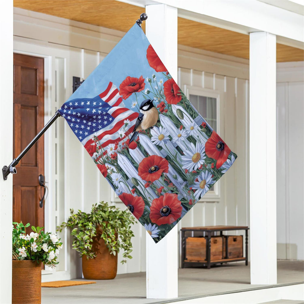 Celebrate the spirit of freedom with the Patriotic Poppies & Bird Suede House Flag. Perfectly sized at 43 inches long and 29 inches wide, this flag beautifully combines vibrant red poppies and a charming bird perched on a white picket fence, all set against the backdrop of the American flag. Crafted from high-quality suede, it offers a soft texture and rich colors that stand out in any season. Ideal for outdoor use, this flag adds a welcoming touch to your porch or garden, making it a perfect choice for patriotic holidays or everyday display.