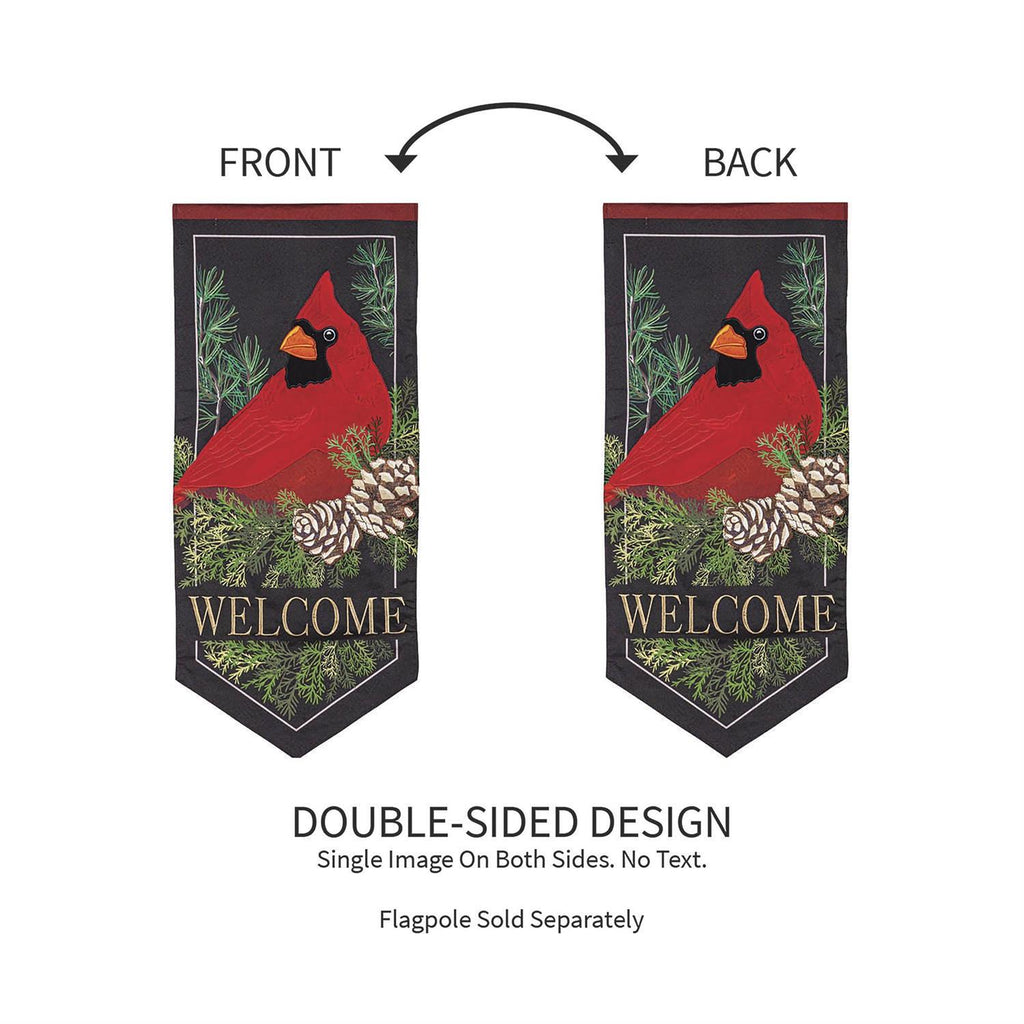 Spread some holiday spirit to guests and passersby with this Cardinal and Evergreen Garden Flag. Everyone will be greeted by a cheerful design and sweet message on a black background. Three-dimensional aspects, such as the cardinal, elevate this uplifting design, as does the detailed stitching. These versatile designs are crafted from a blend of poly-linen that ensures they are indoor and outdoor safe. It’s ideal for holiday decorating or welcoming everyday guests. Perfect for any space, these pieces can be hung on a door or used with a garden flag stand or dowel.