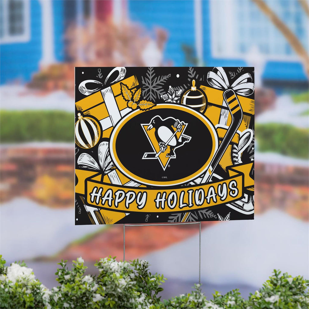Showcase your team spirit this holiday season with the Pittsburgh Penguins Yard Sign. Perfect for adding a festive touch to your garden or walkway, this sign combines holiday cheer with your love for hockey. Measuring 24 inches in length and 18 inches in width, this sign is designed to withstand the elements while maintaining its vibrant colors. Made from durable materials, it features a stunning design with the team's logo surrounded by holiday motifs. Easy to install, this sign is the perfect way to celebrate the holidays and your favorite team simultaneously.