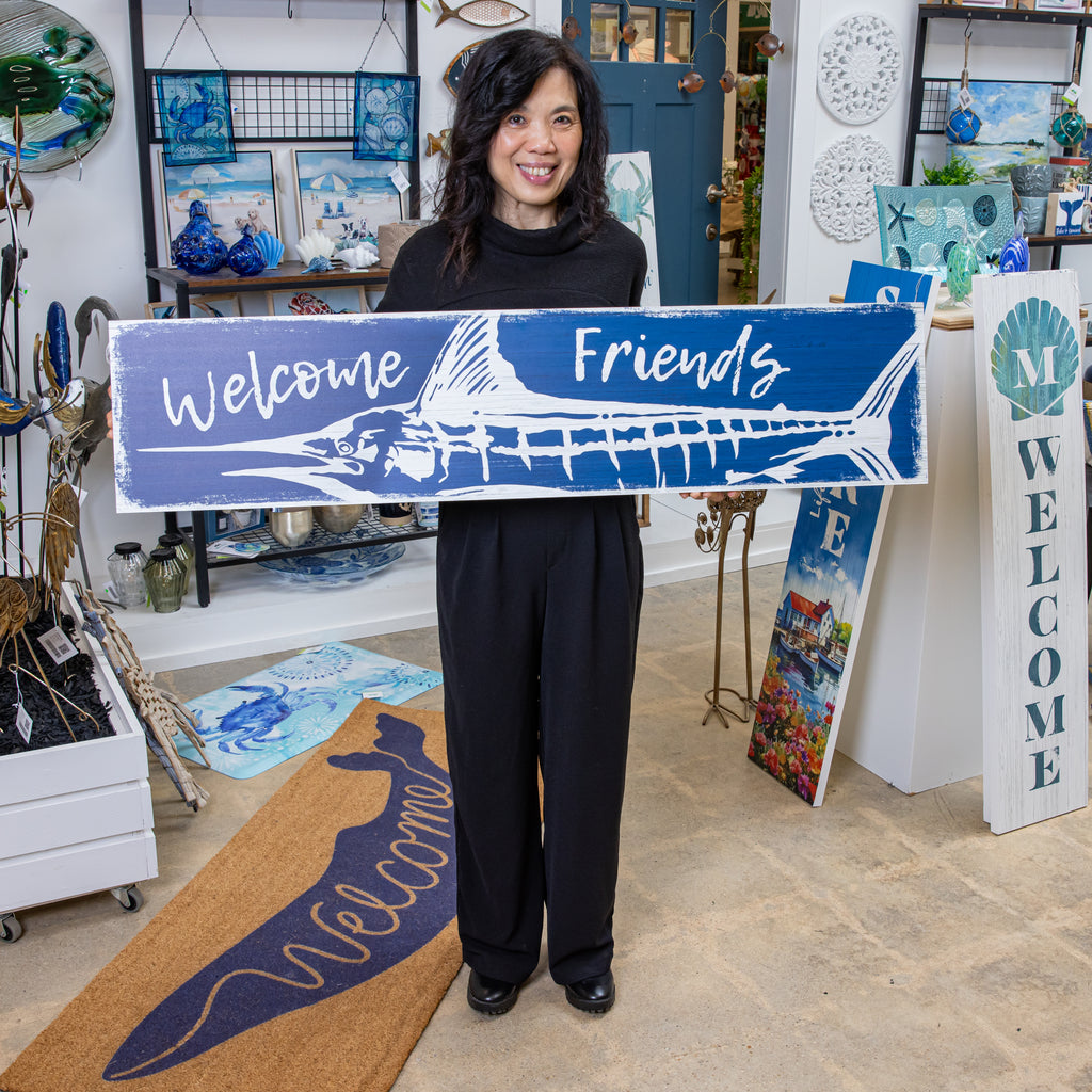 - Features a nautical marlin design with 'Welcome Friends' text, ideal for coastal-themed decor.