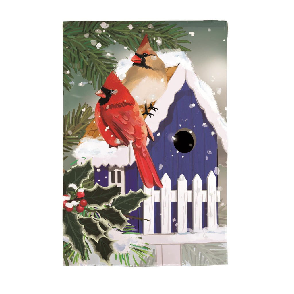Elevate your outdoor décor with the Royal Blue Bird House Single Sided House Flag. Measuring 28 inches by 40 inches, this vibrant flag features a charming scene with cardinals perched on a snow-covered birdhouse, surrounded by lush greenery and holly berries. Perfect for the winter season, this sublimated flag adds a festive touch to any home. Made with high-quality materials, it ensures durability and vibrant color retention, making it a beautiful addition to your garden or porch.