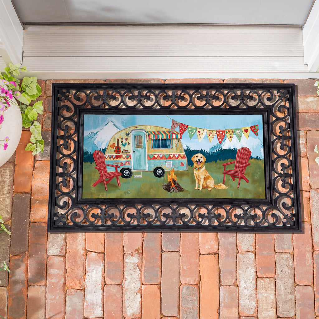 Add charm to your outdoor space with the Camping Dog Sassafras Switch Mat, featuring a delightful scene of a golden retriever next to a camper and campfire.