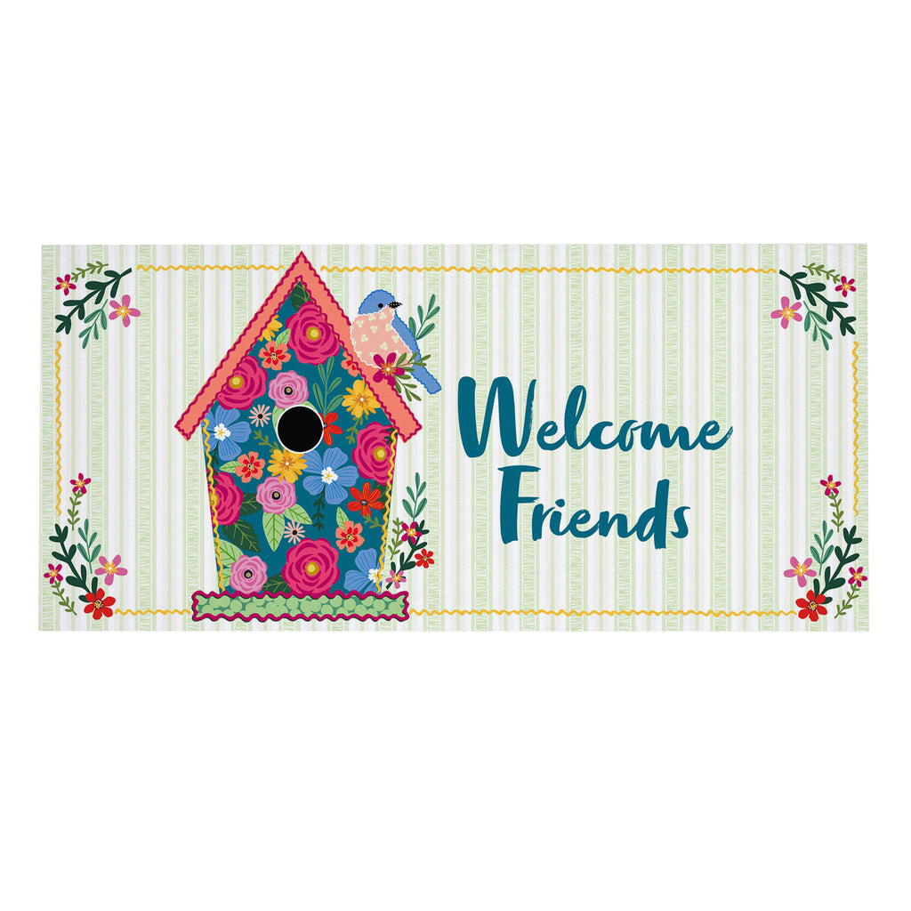 Welcome guests with this charming Ric Rac Birdhouse Sassafras Switch Mat, featuring a colorful birdhouse design and 'Welcome Friends' greeting. Perfect for adding a touch of spring to your doorstep.