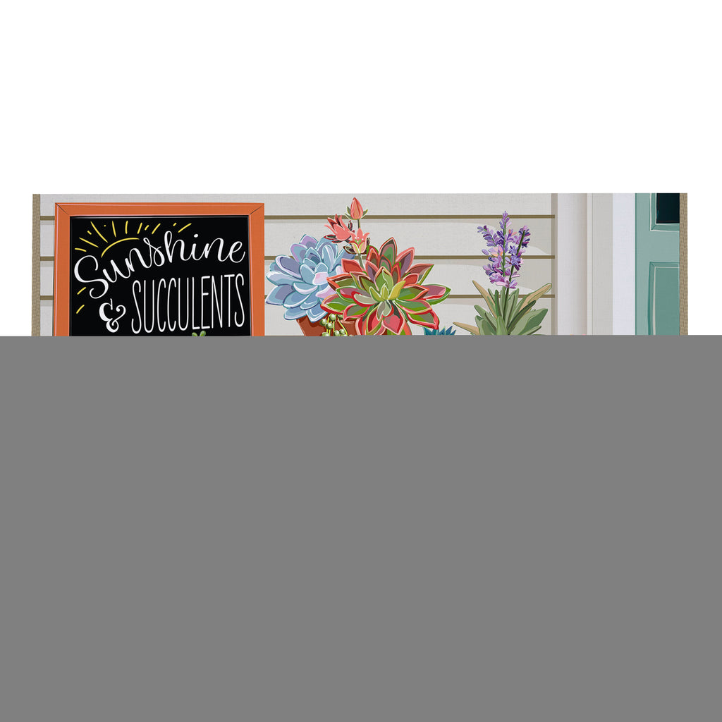Enhance your entryway with the vibrant Succulent In Strawberry Pot Sassafras Switch Mat, perfect for spring and summer seasons. This mat features colorful succulents in decorative pots and a welcoming 'Sunshine & Succulents' sign.