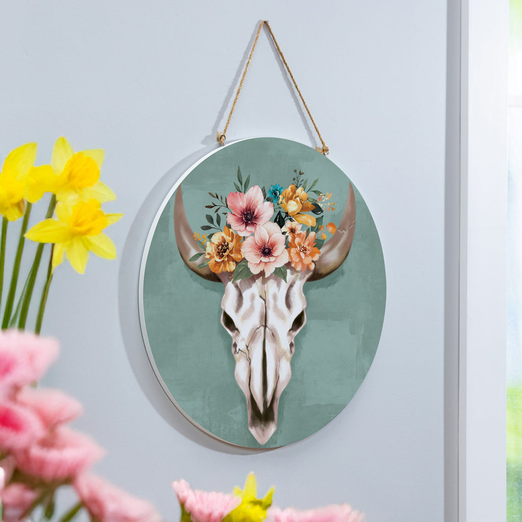 Add a touch of Southwestern flair to your home with this 18-inch wood door decor featuring a steer skull adorned with vibrant summer flowers.