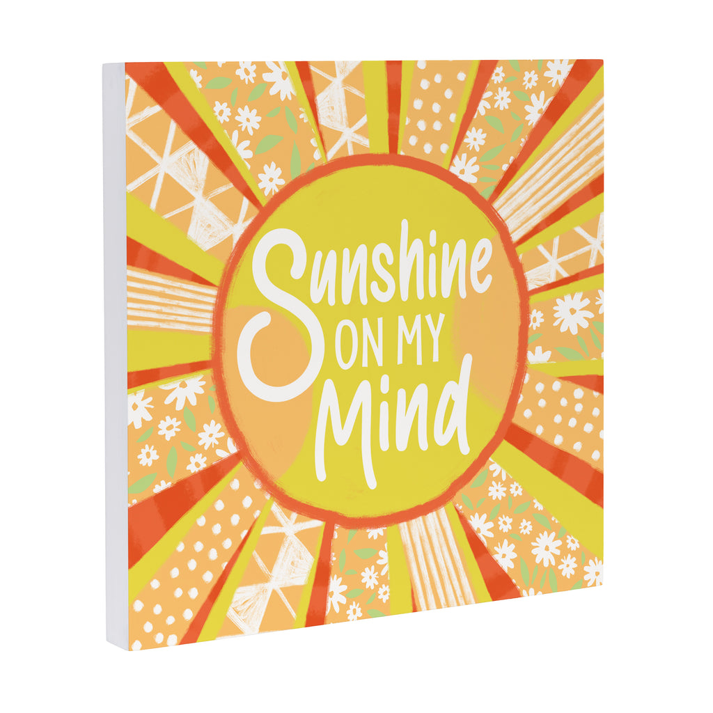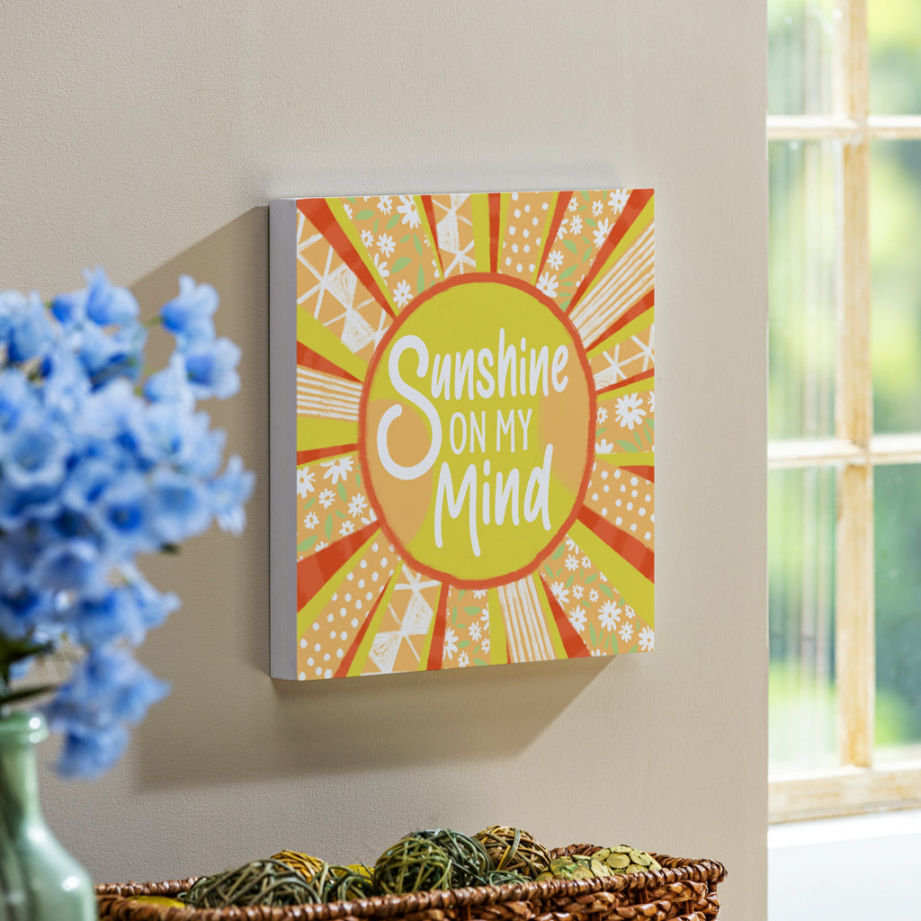 Brighten up your living space with the Blue Coastal Make Waves Indoor Wall Decor featuring the cheerful phrase 'Sunshine On My Mind'. This vibrant piece is perfect for adding a touch of summer to any room.