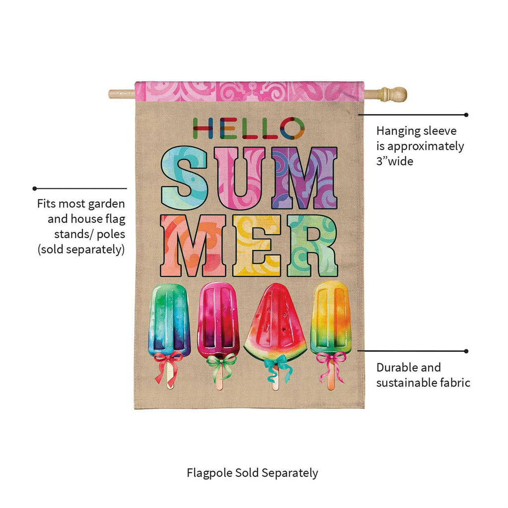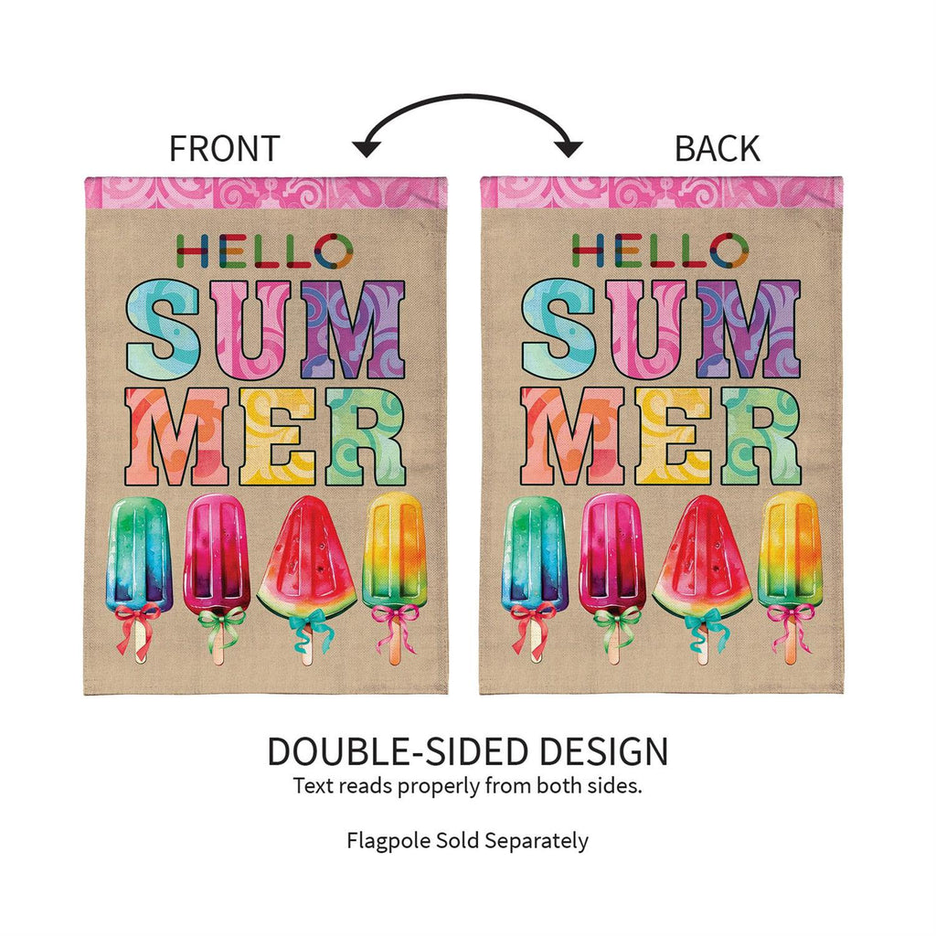 Celebrate the sunny season with the Summer Popsicle Burlap House Flag. This vibrant flag, measuring 44 inches in length and 28 inches in width, is perfect for adding a splash of color to your outdoor space. Crafted from durable burlap, it features colorful popsicles and bold 'Hello Summer' lettering, making it an ideal choice for summer gatherings and backyard parties. Its weather-resistant material ensures it stays vibrant throughout the season, while the easy-to-install design allows for quick decoration updates. Welcome guests with a cheerful, summery vibe that sets the tone for fun and relaxation.