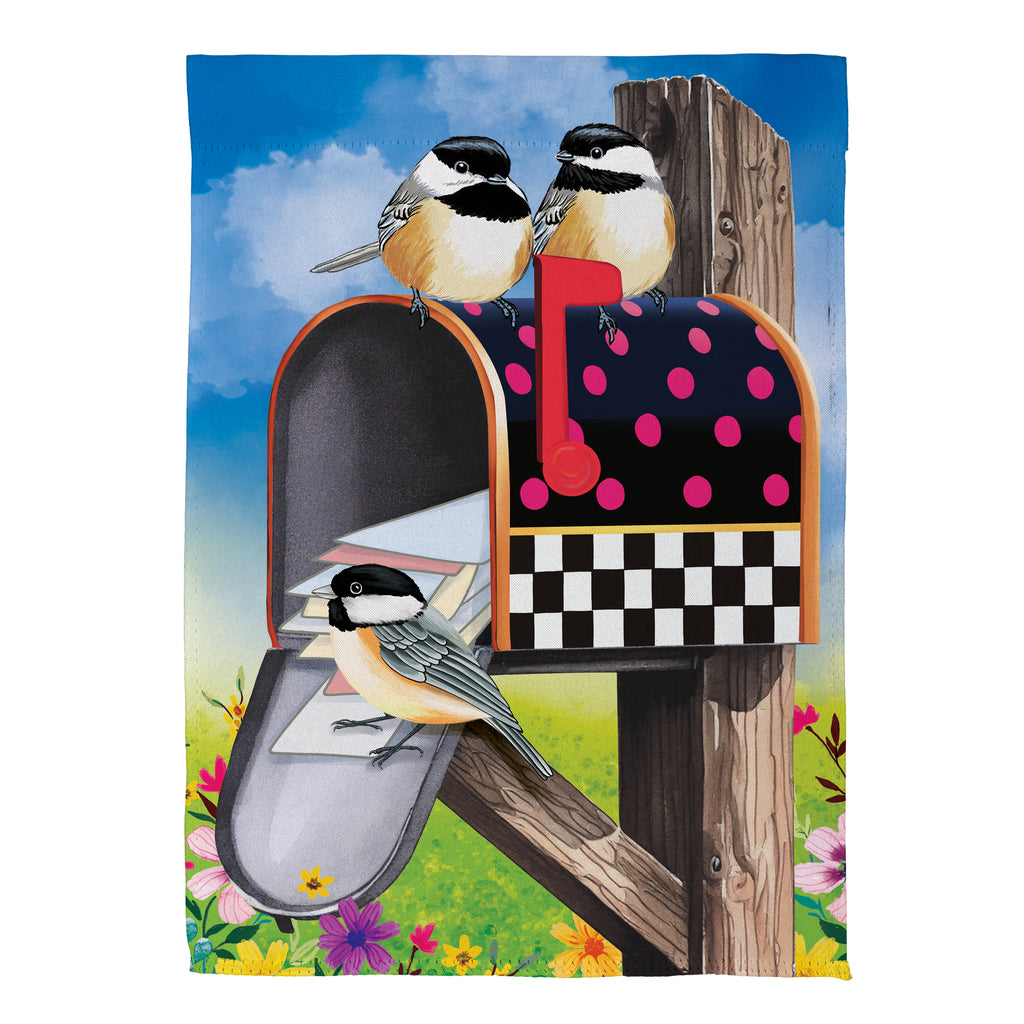 Welcome the beauty of spring with this charming Delivery Chickadees Suede Garden Flag, featuring vibrant chickadees perched on a mailbox amidst colorful flowers.