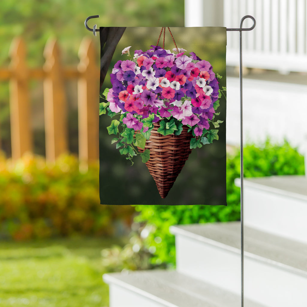 Elevate your outdoor decor with the Petunia Basket Suede Garden Flag, showcasing vibrant spring blooms in a charming woven basket design. Perfect for adding a touch of elegance to any garden setting.