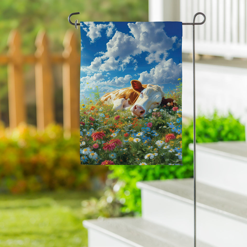 Enhance your outdoor space with the Summer Rest Suede Garden Flag, featuring a serene scene of a cow resting among vibrant spring flowers.