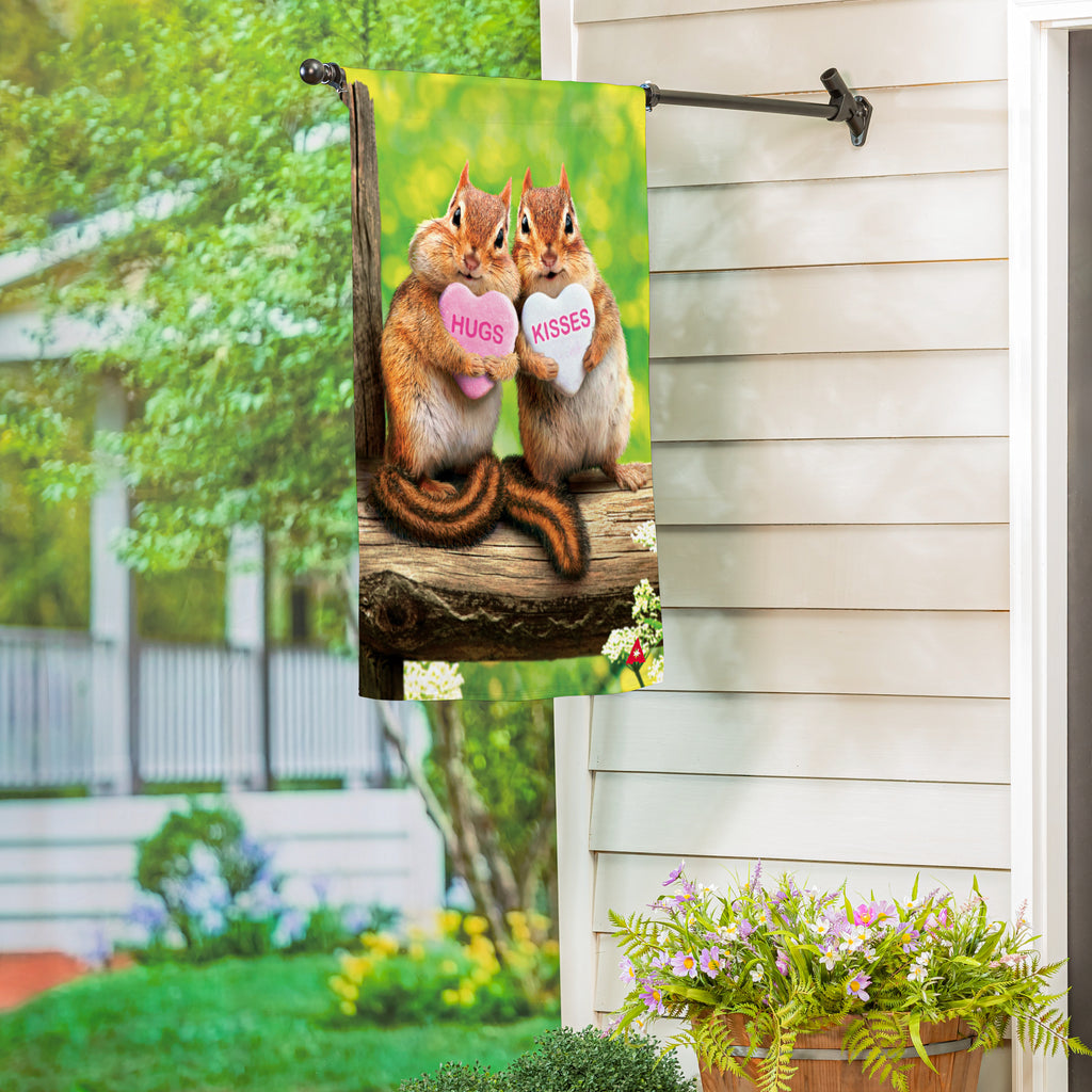 Celebrate the season of love with this charming Valentine Chipmunks Suede House Flag, featuring two adorable chipmunks holding 'Hugs' and 'Kisses' hearts.