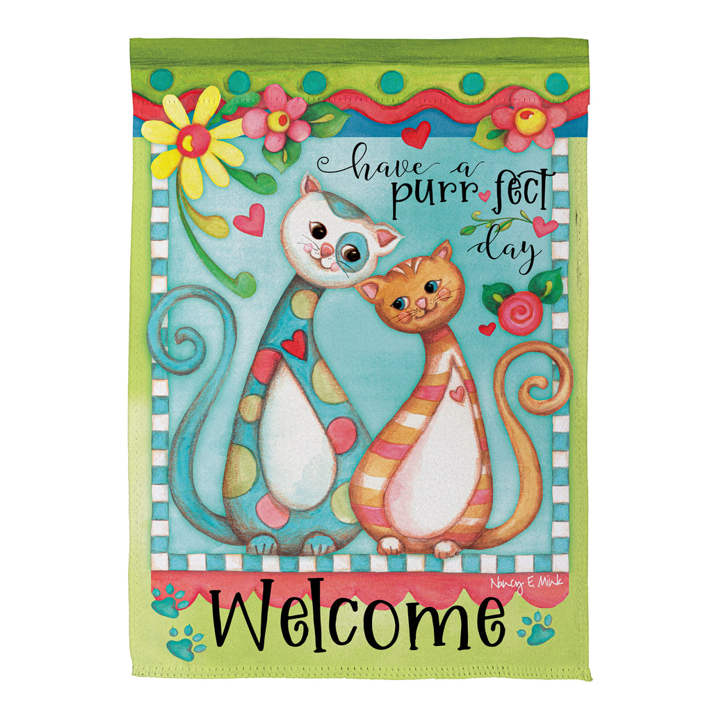 The Purr-fect Day Suede House Flag features a charming cat design with vibrant colors, perfect for adding a playful touch to your outdoor decor. Made from durable suede, this flag is ideal for everyday display.