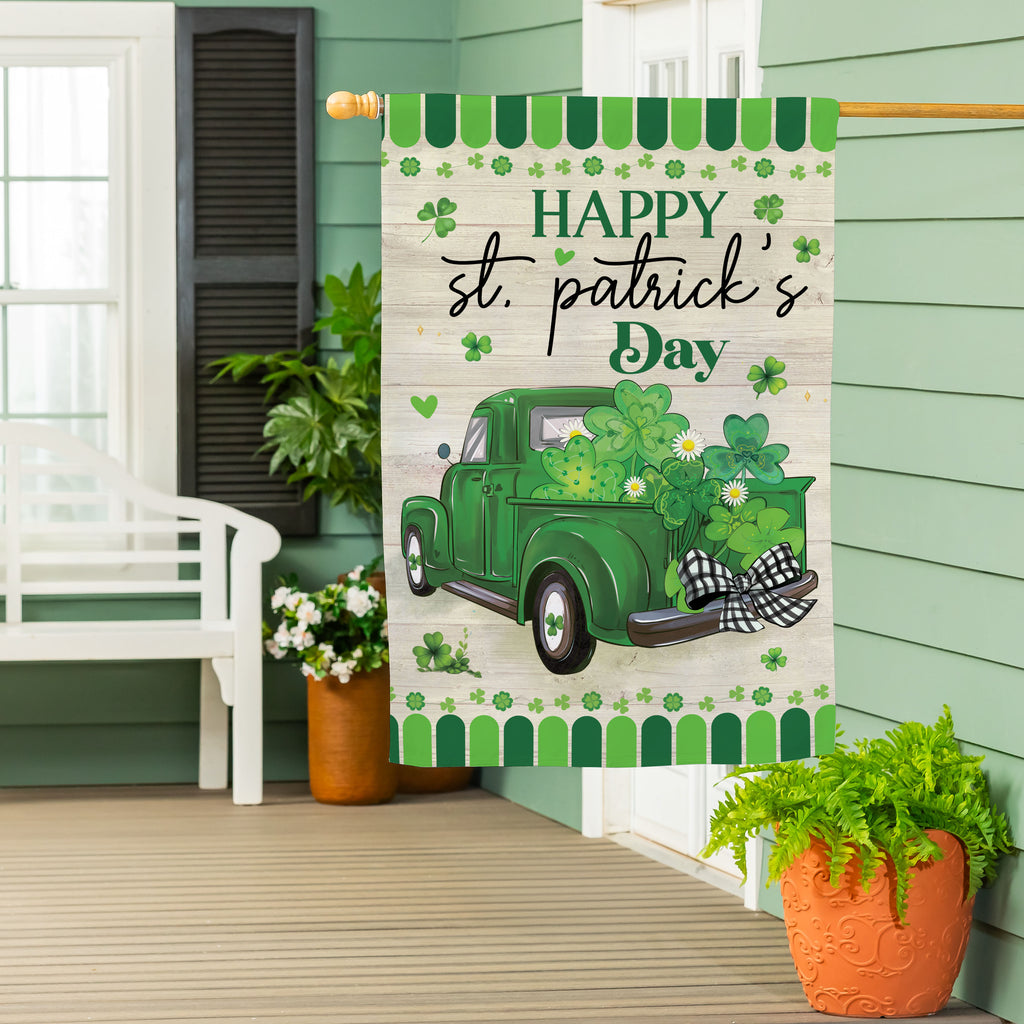Celebrate the spirit of St. Patrick's Day with this charming suede house flag, featuring a vintage green truck adorned with clovers. Perfect for welcoming spring, this flag adds a festive touch to your outdoor decor.