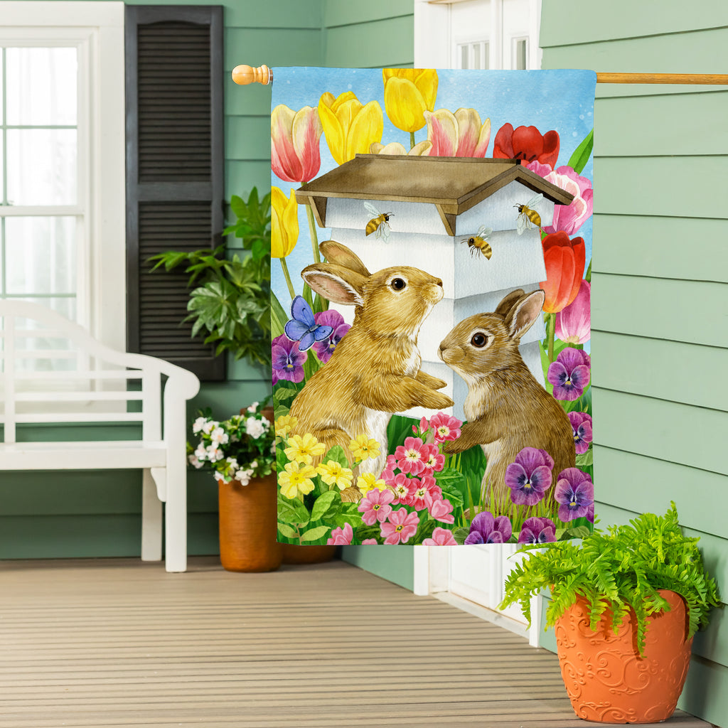 Welcome spring into your home with the Bunny Beehive Suede House Flag, featuring playful bunnies amidst vibrant flowers and a charming beehive.
