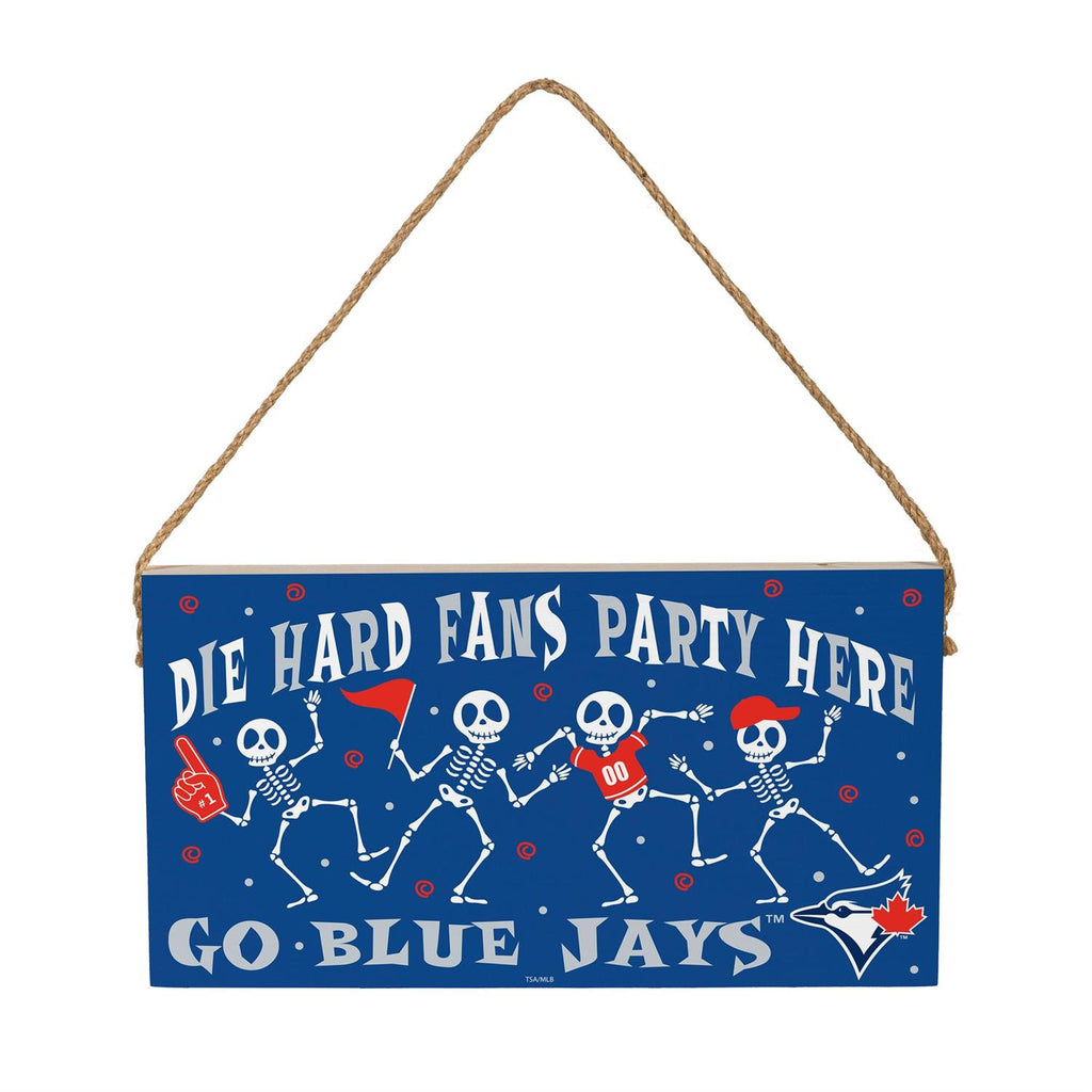 Celebrate Halloween and your love for the Toronto Blue Jays with this festive wood wall sign. Measuring 6x11 inches, this sign is perfect for adding a playful touch to your home or office. Featuring whimsical skeletons and bold team colors, it's an eye-catching piece that's sure to delight guests and fellow fans alike. Crafted from durable wood and equipped with a convenient hanging rope, this sign is easy to display on any wall. Ideal for Halloween parties or as a gift for die-hard Blue Jays supporters, this wall sign is a must-have seasonal décor item.