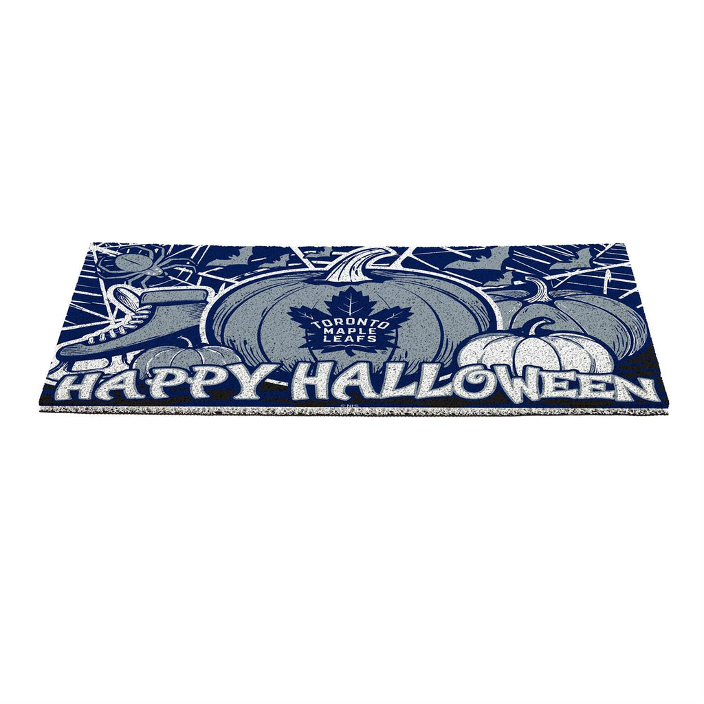 Celebrate Halloween and your love for hockey with this Toronto Maple Leafs Halloween PVC Mat. Measuring 28" x 16", it's the perfect size for your entryway, offering a warm welcome to guests. The mat features a festive design with pumpkins, hockey elements, and a bold "Happy Halloween" message. Made from durable PVC, it's designed to withstand seasonal weather while maintaining its vibrant colors. Ideal for fans looking to combine their team pride with festive décor.