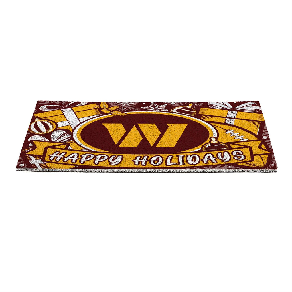 Celebrate the festive season with the Washington Commanders Holiday PVC Mat, perfect for adding team spirit to your entryway. Measuring 28 by 16 inches, this durable mat is designed to withstand the elements while keeping your home clean. The bold team logo and holiday-themed design make it a standout piece for any Commanders fan. Made from high-quality PVC, it offers excellent traction and is easy to clean, ensuring your space remains welcoming and tidy. Enhance your holiday décor and show your team pride with this versatile mat.