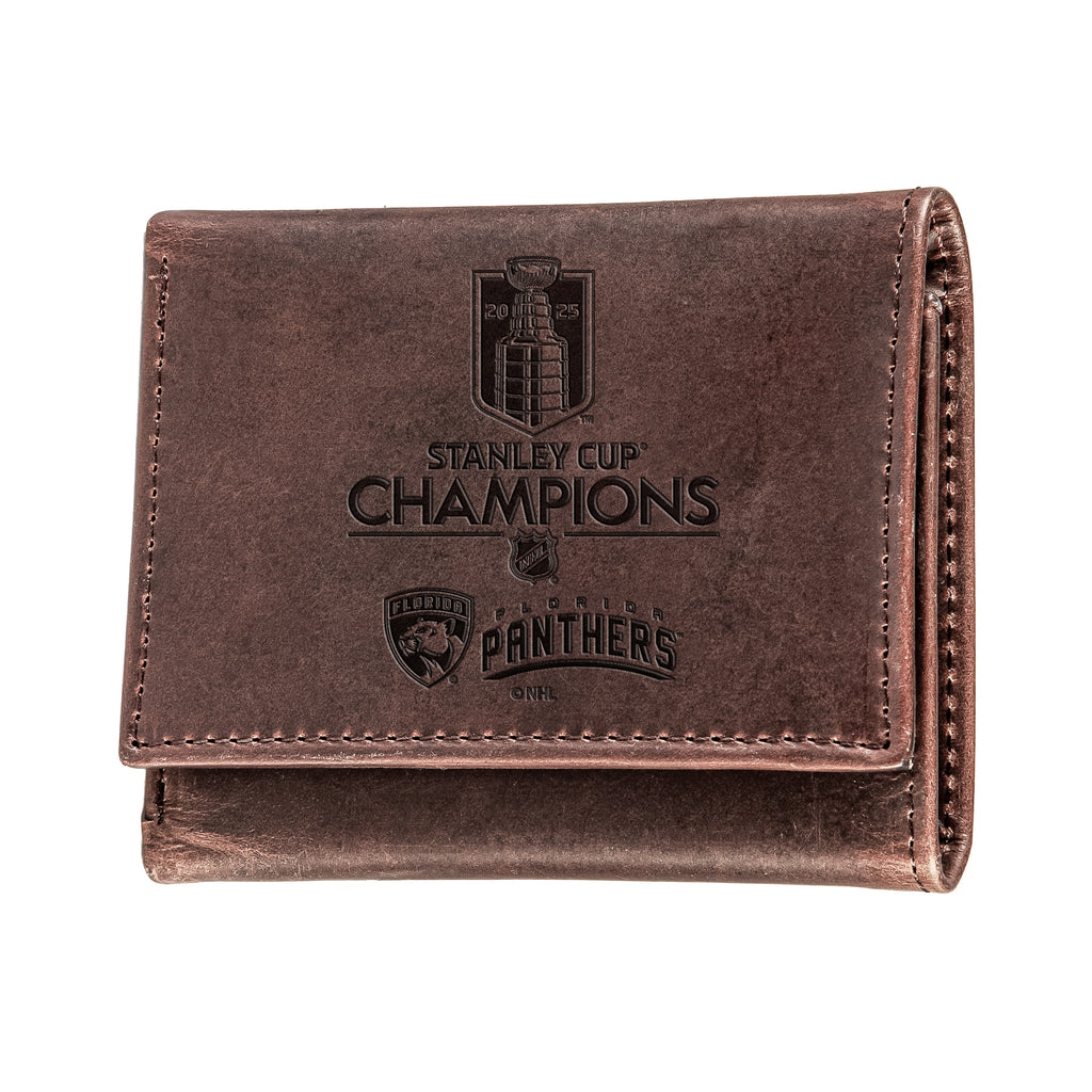 Celebrate the Florida Panthers' triumph as the 2025 Stanley Cup Champions with this stylish tri-fold wallet. Crafted from high-quality brown leather, it features the team's logo and championship details embossed on the front.