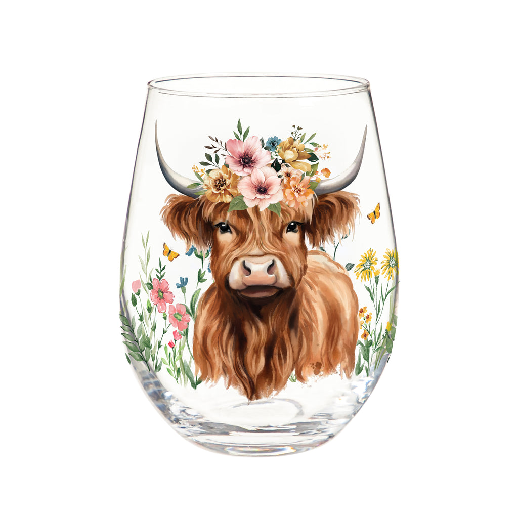 The Petal & Plow Stemless Wine Glass features a charming highland cow adorned with floral accents, perfect for adding a touch of whimsy to your drinkware collection.